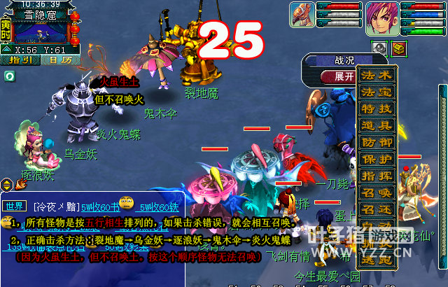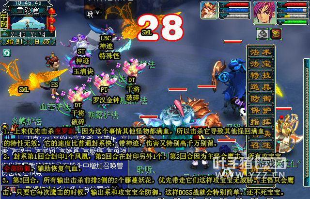 更多攻略:如梦奇谭五更寒抢先玩:魔幻般剧情场景 【背景介绍】六棱雪花镖,是一种消失多年的武器。在那些早已尘封的故事里,这枚如同雪花一般纤弱的飞镖,带来的却是最为血腥的问候。许多年后,这枚飞镖又重新出现在三界,和当年一样,凝结着见血封喉的毒药,也凝结着孤注一掷的决绝。是谁把这枚雪花镖送回了灵隐雪峰?又是谁,带来了那个让雪灵狐无法割舍的人? 【活动条件】∶ 1.玩家等级≥50级,队伍人数=5,队员均拥有对应剧目戏票方可开启任务。 2.购买戏票需要消耗150点副本积分。 3. 必须五人组队领取,且每一个环节必须有3个领取任务的玩家参与才能通过 【活动时间】∶ 1.任务时间限制:180分钟。 2.每周一将更新“如梦奇谭”剧目列表。 【其他说明】∶ 1.如梦奇谭任务无论成功完成或者是失败,每名玩家每周只能领取每种任务一次。 2.任务过程必须至少有3名领取任务的玩家参与才能顺利进入到下一环。 3.除必死剧情外,战斗死亡按正常死亡计算。 4.任务过程中,玩家可使用飞行符、导标旗、月光宝盒、回门派等方式离开虚拟场景,与癫散班主交谈选取选项“我要继续观看如梦奇谭”即可返回任务对应虚拟场景。 队伍配置∶ 根据自身硬件可以考虑一辅助一封系或者二辅助一封系的阵容。 主线任务∶ 进入任务场景,一段动画。第一场战斗就是眼前的碧血蚕妖。 千年蛇魅∶ 主怪只会使用特技停陷术,不要管它。 天将∶门派ST,速度一般,物伤较高。 僵尸∶门派DF,速度较快,携带吸血和残月特技。 黑山老妖∶门派DT,速度一般,物理伤害一般,携带破血特技。 龟丞相∶门派LG,速度慢携带魔兽之印特技,法伤低。 小贴士∶ 1,第一回合所有怪物〔天将除外〕都会使用特技。 2,其实输出系,只要击杀2个黑山老妖。封系封印2个天将即可。 3,龟丞相法伤很低的。所以击杀黑山后在击杀即可。 根据任务栏的坐标提示,找到陶弘景获得药材。 将药材给予雪灵狐后,经过一段动画后。迎来一场非常艰难的防守战。 玩家需要在幽光玉灵气耗尽之前,击败3波,总9只蛊虫。每波蛊虫间隔15分钟。 第一波蛊虫——碧血蚕妖〔总共3只〕∶ 小贴士∶ 1,第一波,怪物中。如果你击杀星灵仙子的话,会导致所有怪物全部回满血。 2,最好优先击杀,其他小怪。在击杀星灵仙子,效率会高很多。 第二波蛊虫——魅影毒蝎〔总共3只,有随机特殊战斗〕∶ 魅影毒蝎∶百足将军会破血特技优先击杀,其他无特色。总共4只。 小贴士∶ 1,如果变异蛤蟆精,在场上的话,无法对其他怪物造成伤害〔只能造成1点伤害〕 2,优先击杀变异蛤蟆精,击飞后的第2回合,就可以对所有怪物造成正常伤害。 第三波蛊虫——炎火鬼蝶〔总共3只,有随机特殊战斗〕∶ 小贴士∶ 1,逐浪妖和裂地魔,乌金妖和鬼木伞它们两组怪当对方被击杀的时候,都会相互召唤。所以最好按组一组一组击杀会效率高很多。 2,主怪为随机门派,抗性较高,血量较多可以最后在击杀。。 小贴士∶ 1,所有怪物是按五行相生排列的,如果击杀错误,就会相互召唤。 2,正确击杀方法∶裂地魔→乌金妖→逐浪妖→鬼木伞→炎火鬼蝶 〔因为火虽生土,但不召唤土。按这个顺序怪物无法召唤〕 。 BOSS战∶ 完成防守战后,就迎来了与锦雀的BOSS战。 小贴士∶ 1,上来优先击杀夜罗刹,因为这个事情其他怪物都满血,所以击杀它导致其他怪回满血的特性无效。它的速度比普通封系快,带神迹,伤害又特别高千万别留。 2,封系第1回合封印1个凤凰,第2回合在封印另外1个。第2回合因为主怪会鹰击,所有攻宝宝全部防御。辅助恢复气血。 3,第3回合,所有输出击杀前排2侧的2个藤蔓妖花,优先带走它们这样攻宝宝无威胁。主怪只会鹰击,只要它每次鹰击的时候,输出系和攻宝宝全防御。这样BOSS战就会特别简单,还不死宝宝。