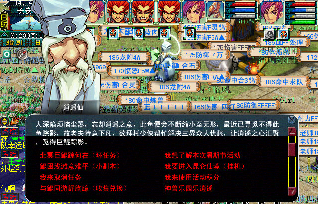 北冥巨鲲踪何在(多人环式) 活动时间: 2015年6月30日12:00至7月14日8:00期间全天 领取要求: 玩家等级≥30级,队伍人数≥3人 玩家在长安城(230,120)逍遥仙处领取任务。 |