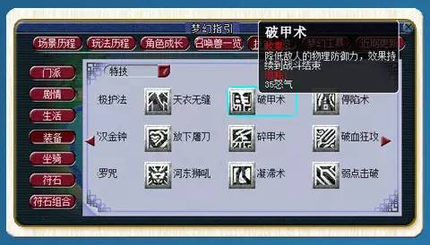 破甲术 技能效果:降低敌方单体10%的物理防御,效果持续到战斗结束。 技能消耗:35怒气 解读:破甲术是玩家手里最锋利的一把刀!如果再加上方寸的减防和宝宝的碎甲刃效果,甚至连辅助都能够被点杀! 以上5个特技都是辅助和封系必备的,而追求全身6特技的玩家可以额外选择一个玉清诀。为什么会选择玉清诀呢?因为在有愤怒腰带的情况下,施放晶清诀所消耗的愤怒是120点,而玉清诀才100点,在被对面封系压制的喘不过气来的时候;在想持续压制对面但是怕对面封系干扰的时候;在愤怒值不够晶清但可以玉清的时候,玉清诀的价值就体现了出来。如果没带玉清,刚好遇到差几点愤怒不能解封的情况无疑相当尴尬。 好了,关于辅助和封系的特技选择就说到这里,希望能对小伙伴们有所帮助。以上所说的几种特技只是大众化的选择,玩家们如果有自己的队伍,有自己的思路,也可以自行研究一下其他特技,期待大家玩出自己的风采!