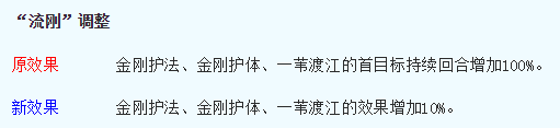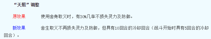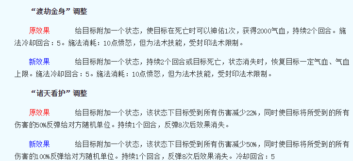 频繁使用舍生的的是削弱了,偶尔用的是增强了。 应该还是修改后的效果更好。 大招修改: 修改前,金身必须死亡才能生效,现在目标不死,2回合后也会回血,但是会多少血只有网易知道。 看护则是加效果加CD的一般套路。 |
