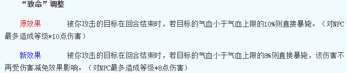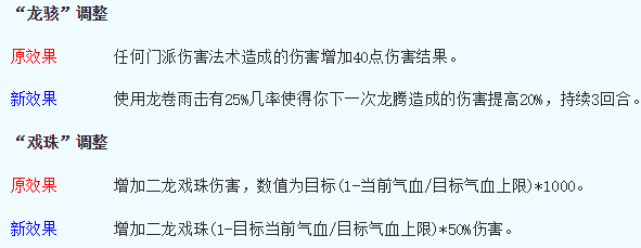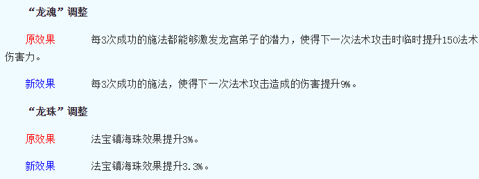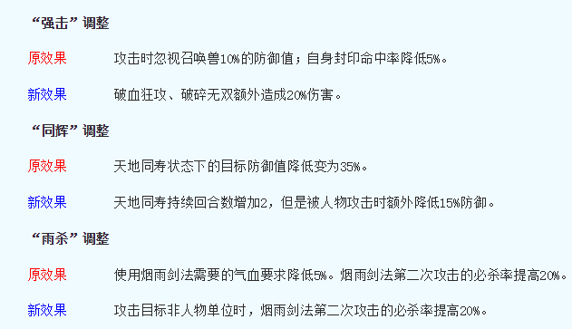 龙骇调整对于对面罗汉了秒不动,需要龙腾BB的时候还是很有利的。 二龙,对方满血,不增加伤害;对方半血,增加25%伤害,对方空血,增加50%伤害。 总的来看,对面有罗汉,二龙跪了,对面没罗汉,是加强,特别是对面有脆皮一速封的时候。 服战大热门WZ终遭策划毒手。。。。 清宝宝效率下降,不过破血破碎给予加强。另外,破碎提升20%伤害是否包括打蓝,有待验证。 天地正常效果是降低50%防御,并且额外受到50%的物理伤害结果,持续5回合,变净瓶是20回合。 现在天地不能永恒,持续7回合,被对面人物攻击视为防御降低了65%,这下谁用谁死。 烟雨也削弱了,气血要求的提高会使得很多不明就里的玩家罚站1回合。 算是非常微弱的削弱吧。 这里的伤害减免效果,WD的明光宝烛就算一个。 [编辑:夏大雨]