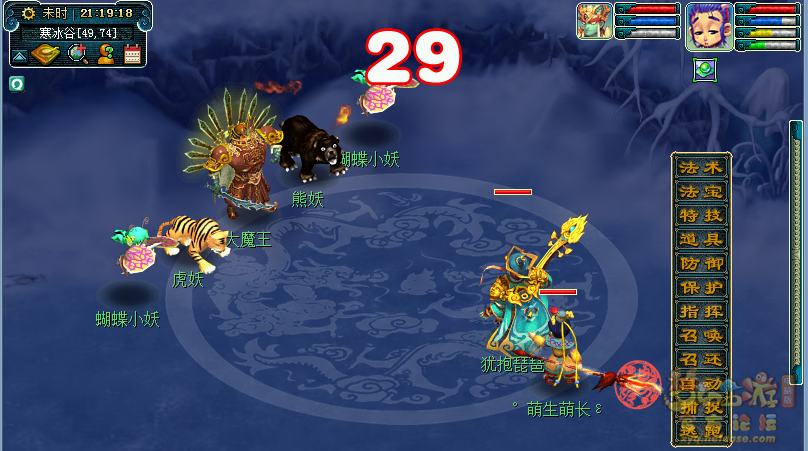 此场战斗为BOSS战,大魔王为狮驼岭,会使用鹰击。虎妖为五庄观,会封印和烟雨剑法。熊妖为凌波城,会浪涌、断岳式、翻江倒海等技能,左右两只蝴蝶为普陀山,会使用紧箍咒,普度众生,五行法术。此场战斗有一定难度,建议携带恢复气血的药品或特技。输出玩家建议与辅助门派一起组队完成。