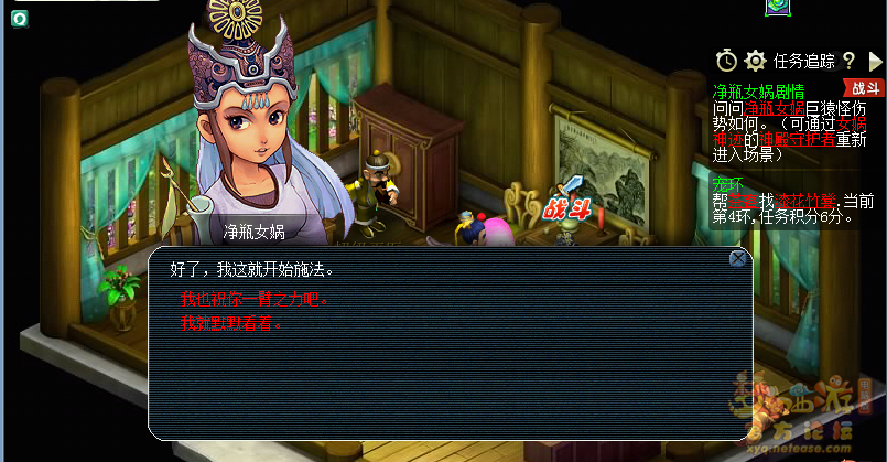 解决战斗之后,少侠担心净瓶女娲的伤势,提议返回女娲神迹找律法女娲和灵符女娲帮助净瓶女娲疗伤,却意外发现净瓶女娲已经恢复法力。这时,观音娘娘显灵,净瓶女娲陷入沉思。