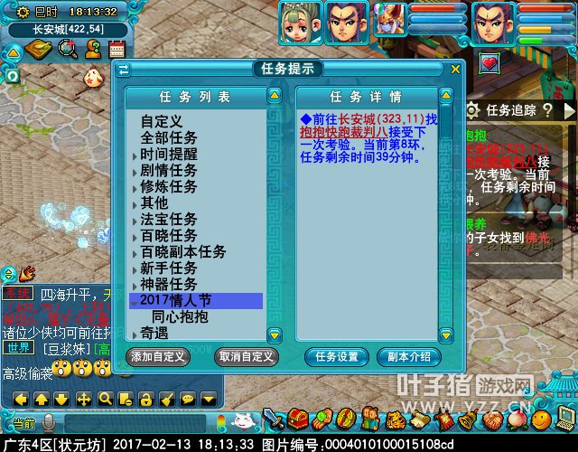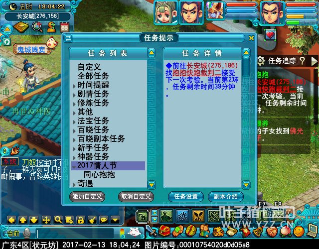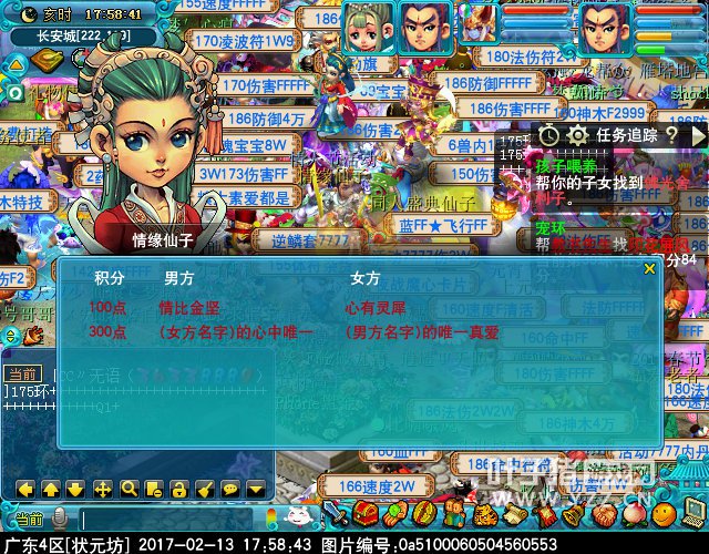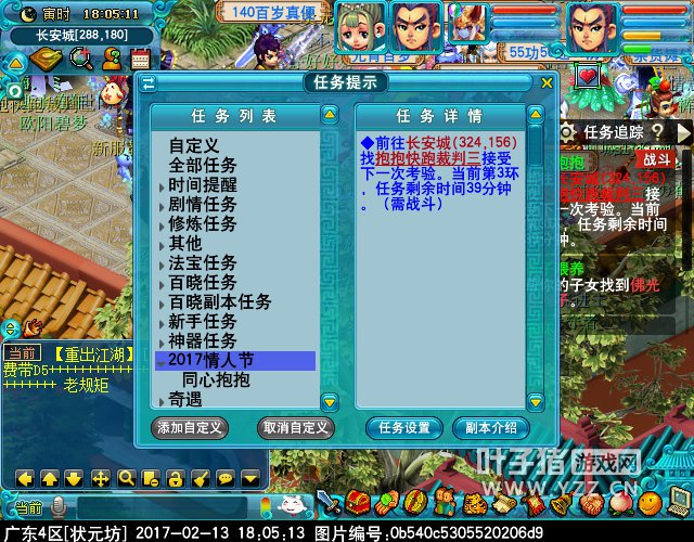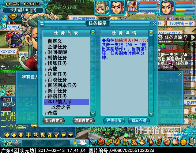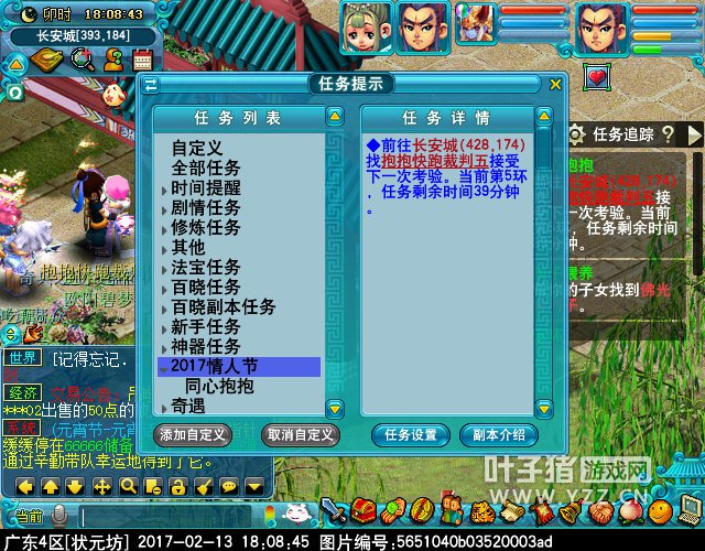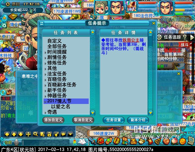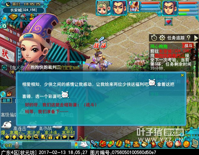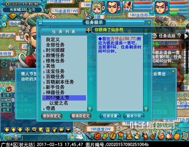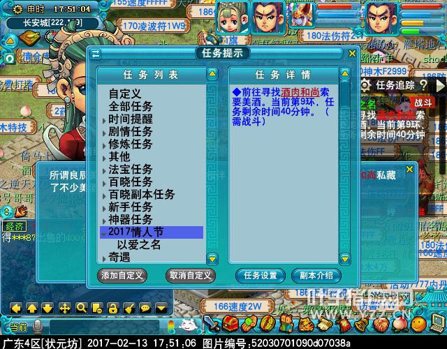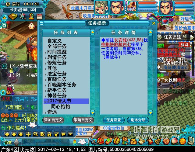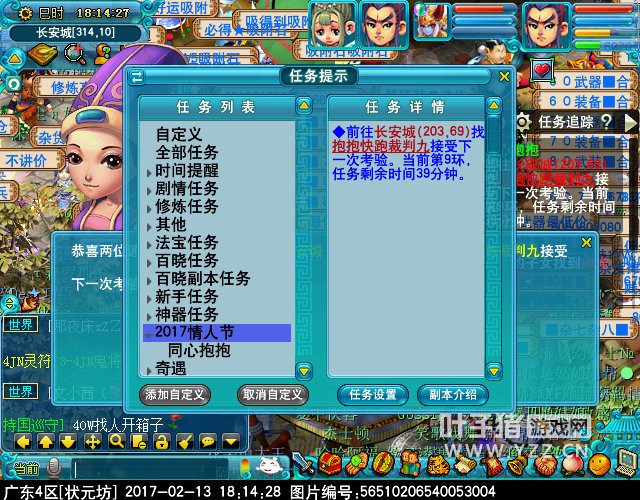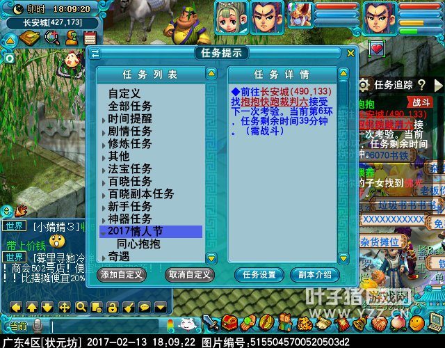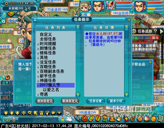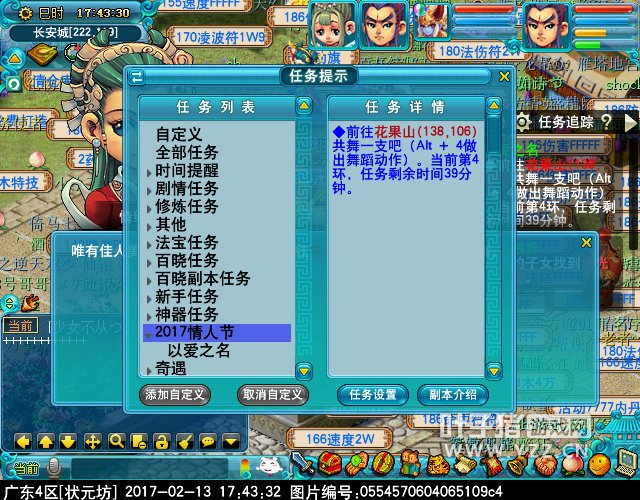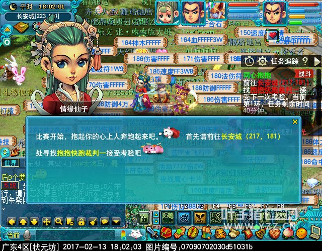 Hello,猪友们,今天小编给大家带来2017的情人节活动攻略,目前大家都在忙着刷元宵节活动,估计都定了闹钟吧,也是蛮拼的!所以世界上并没有太多的情人节物品刷出信息,问精灵据说有令牌、五宝、兽决、红玫瑰、内丹及加好友点的道具,估计令牌是在合成道具的第三栏,说能合成神秘物品那里产出的吧!有刷这个活动的猪友可以看看。 多人环式的话,如果有飞行祥瑞的话可以建议玩玩,否则小编不建议,这特么路太远了,都是什么酒肉和尚,花果山呢,从门口到远方,不胜枚举,策划的意思是不坑点点卡都不舍得我们过情人节了是吧? 抱抱大赛按提示还是能轻松过关的,下面小编就详细给大家讲解一下! 测试队伍镇! 领取这个任务后会获得道具,到指定地点使用,会让你匹配图标。