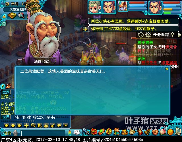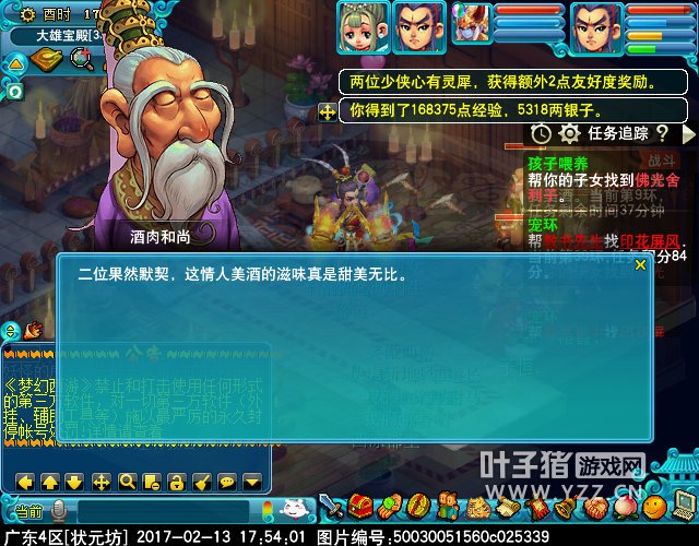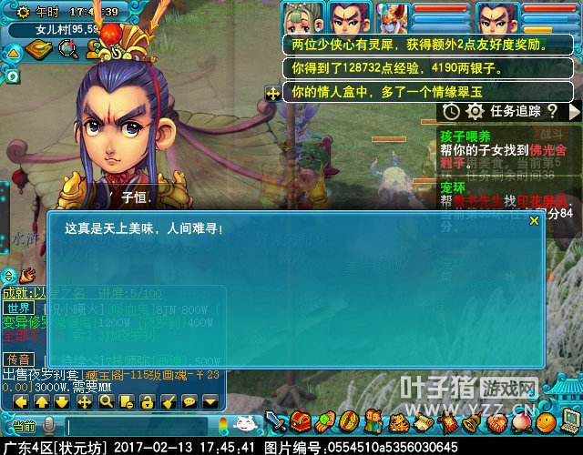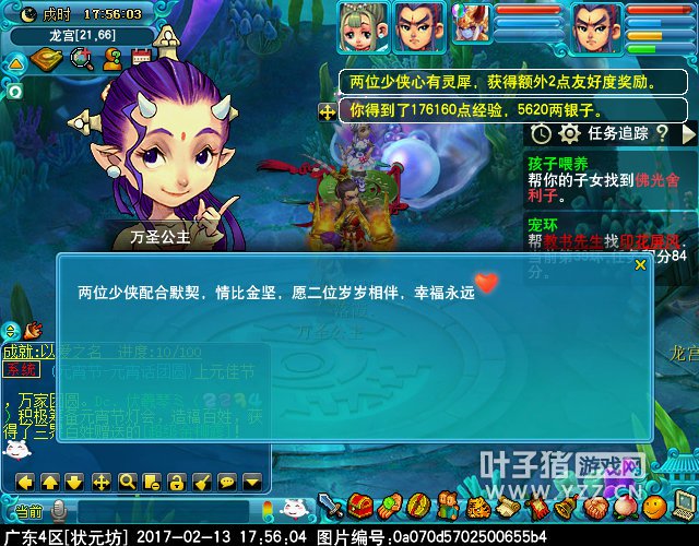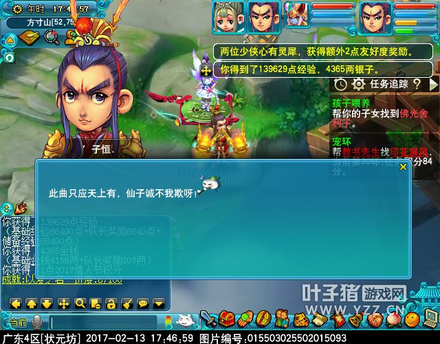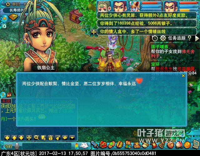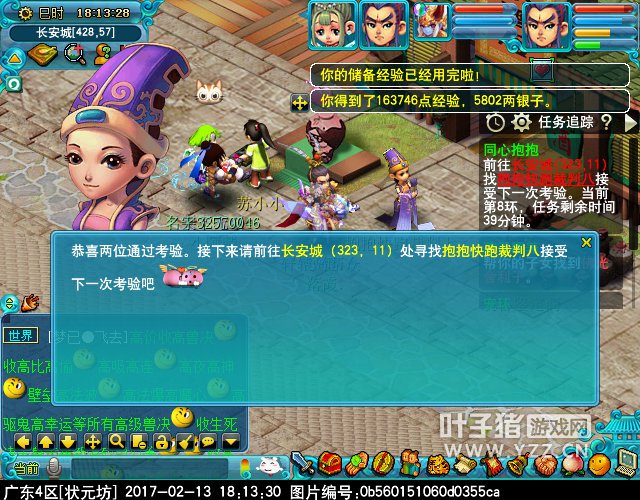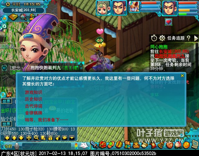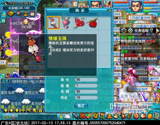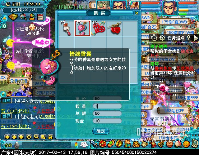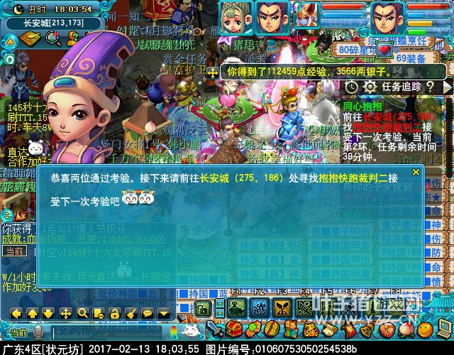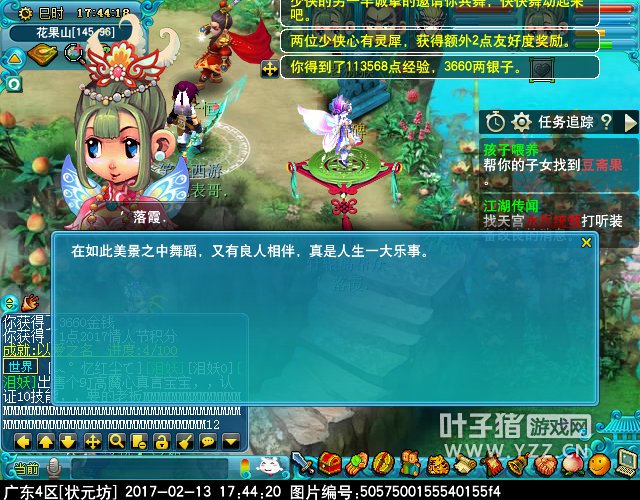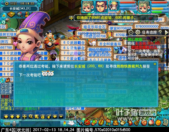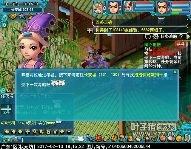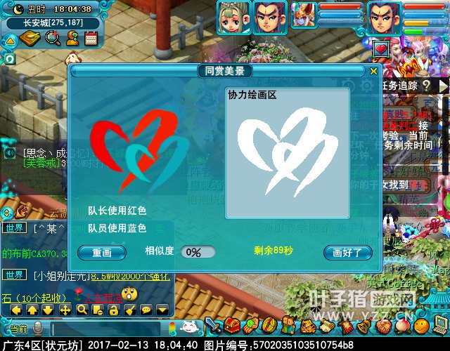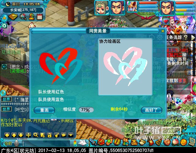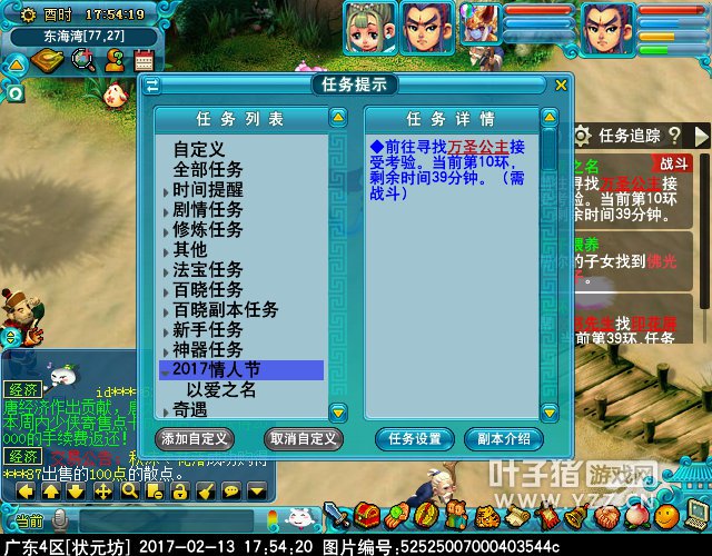 Hello,猪友们,今天小编给大家带来2017的情人节活动攻略,目前大家都在忙着刷元宵节活动,估计都定了闹钟吧,也是蛮拼的!所以世界上并没有太多的情人节物品刷出信息,问精灵据说有令牌、五宝、兽决、红玫瑰、内丹及加好友点的道具,估计令牌是在合成道具的第三栏,说能合成神秘物品那里产出的吧!有刷这个活动的猪友可以看看。 多人环式的话,如果有飞行祥瑞的话可以建议玩玩,否则小编不建议,这特么路太远了,都是什么酒肉和尚,花果山呢,从门口到远方,不胜枚举,策划的意思是不坑点点卡都不舍得我们过情人节了是吧? 抱抱大赛按提示还是能轻松过关的,下面小编就详细给大家讲解一下! 测试队伍镇! 领取这个任务后会获得道具,到指定地点使用,会让你匹配图标。
