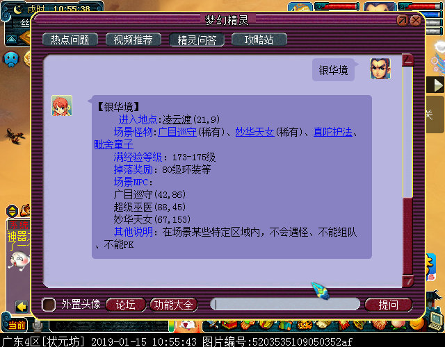 《梦幻西游》电脑版2019全新资料片《名扬三界》在测试服放出了,今天笔者带猪友们走一遭新地图场景“银华境”!入口在凌云渡(21,9),满经验等级是173-175,场景怪有广目巡守、妙华天女、真陀护法及毗舍童子。 总的来说,这个场景有点类似凌云渡,左下角的架构和设计风格是与凌云渡一致的,通过银华境(62,82)处可以登上云端,抵达广目巡守雕像所在处。感觉广目的手就像一摆渡的,想上去要等那双大手移动过来,而且不站中央似乎就不开船。。。 与以往场景地图不同的是,到达彼岸后,你可以看到宝象国、长寿村、傲来国等诸多人间场景的画面,包括你正在抓鬼。。。真的是,你的背后有双眼! 如果要“坐船”回去,那需要站在大手中间的法印,即银华境(133,109)处,才能搭船下去。 银华境右上角最特别的地方在于,整个架构是按照广目巡守的形象设计的,小佛像会左右摇动,你可以在他的武器上翻滚,也可以沿着飘带左右摇摆,还可以靠近巡守脸处,推荐开启1024*768分辨率,这样你可以感受到有多震撼!不过感觉睁着双眼的广目有点狰狞,这大概就是召唤兽一直眯着眼的原因吧! 下面一起来看看详细的细节!