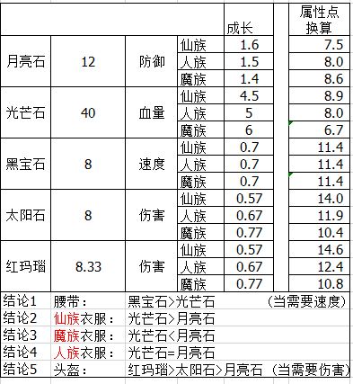 一点力量 一点魔力 ![]() 一点敏捷 上图告诉我们,魔力增加的灵力和敏捷增加的速度都是一样的, 各个种族的主要区别在于体质,耐力和力量三种。 那么,这跟今天的主题宝石选择有什么关系呢? 宝石选择的最终目的,就是让自己的角色变的更强。 刚才我们提到,相同属性点,不同种族的角色得到的增益不同。 比如,同样想获取100点伤害,100点气血,100点防御,三个种族付出的属性点是不同的。 而宝石给人物带来的属性影响是固定的。 小柒列了一张表格,可以通过这张表格,来判定,装备打什么宝石收益高 ![]() 上图中,结论1和结论5,当你需要有限速度和有限伤害时。 打宝石优先级高于加点。(下文详解)