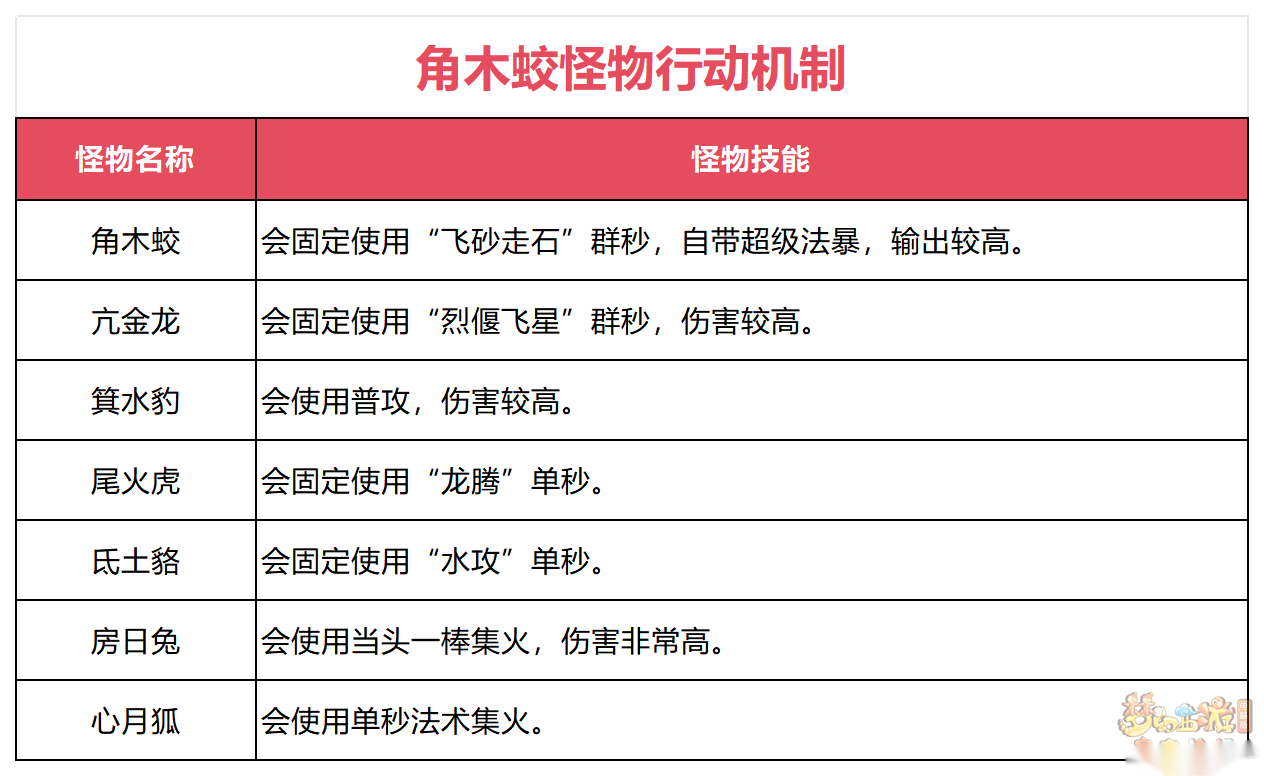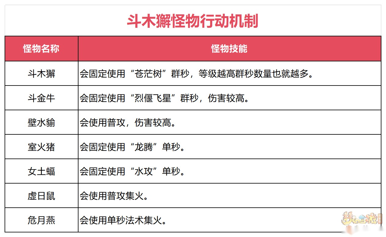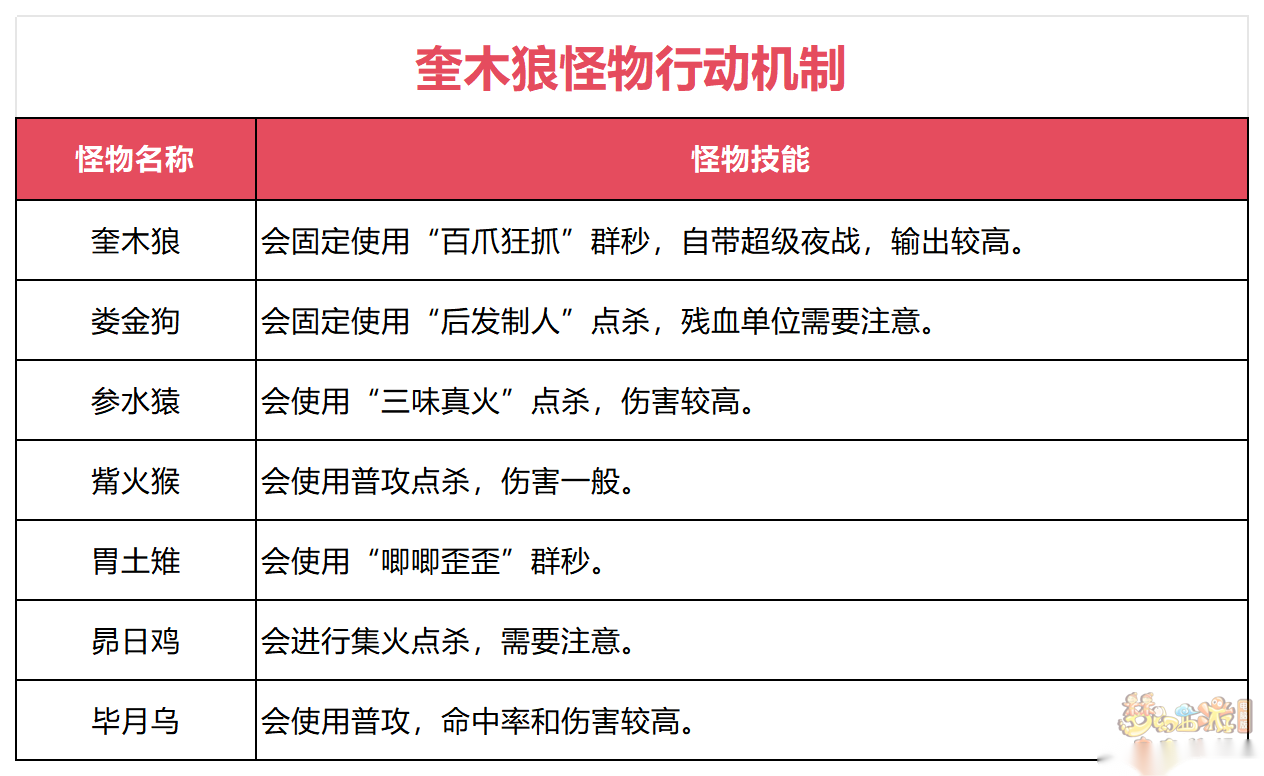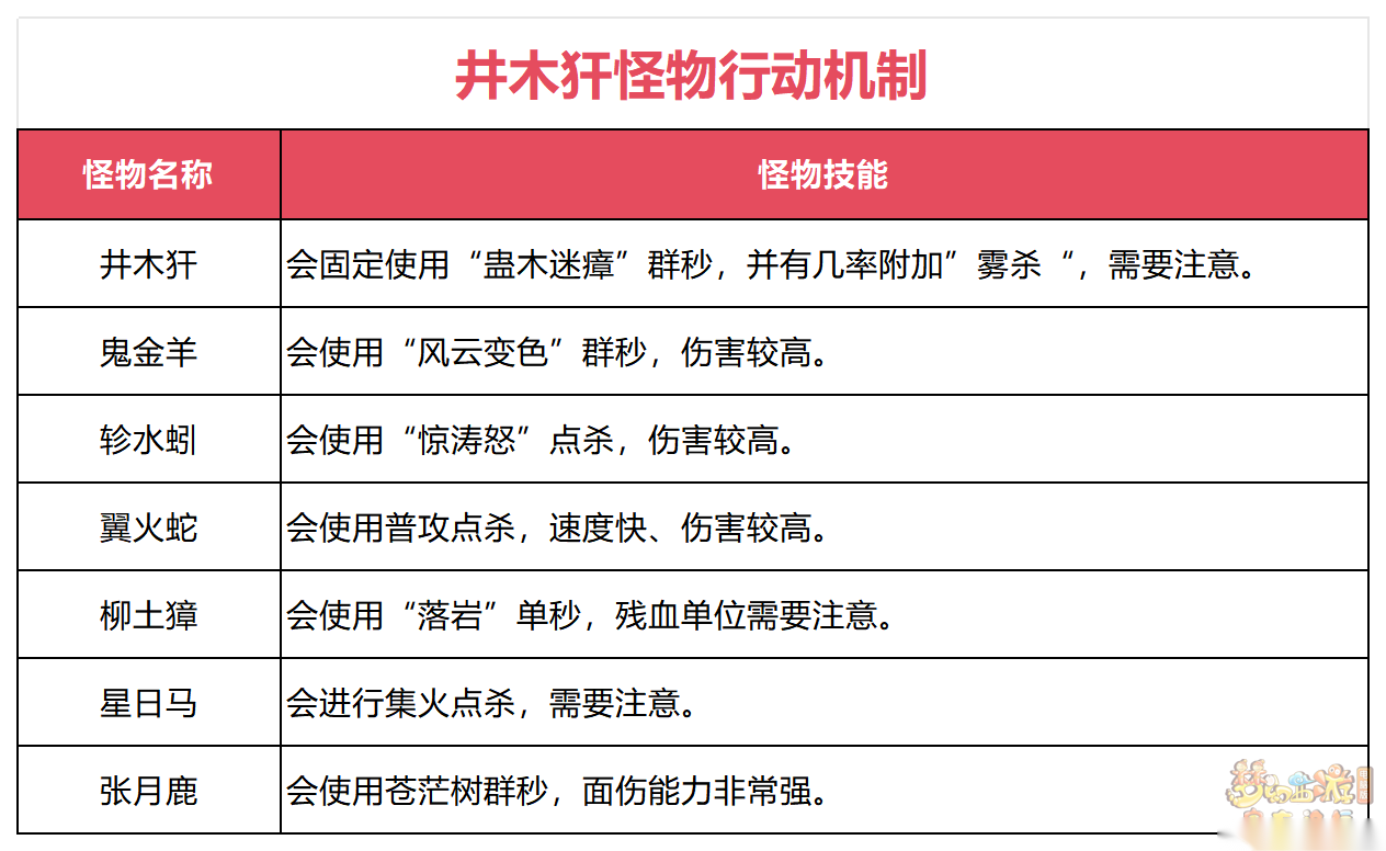 梦幻西游“新二十八星宿”活动挑战攻略之斗木獬、角木蛟、奎木狼、井木犴 新二十八星宿活动时间为每周一至周六14:00/16:00/20:00/22:00。在该活动中,大家可以挑战28星宿赢取奖励。下面,就给大家带来斗木獬、角木蛟、奎木狼、井木犴的挑战攻略吧。 斗木獬、角木蛟、奎木狼、井木犴挑战思路和技巧 参与“新二十八星宿”活动前,大家可以在星宿之主处查询本周刷新的星宿。需要注意的是,挑战活动是分昼夜的,14:00/16:00为白天,20:00/22:00为夜晚,即便白天和夜晚挑战的是同一星宿,前排的沉睡星宿和攻击机制也会有所不同。 比如,井木犴在14:00和16:00时,前排的沉睡星宿为星日马,在20:00和22:00时,前排的沉睡星宿为张月鹿。从目前积累的挑战经验来看,白天挑战时,前排怪物主要以物理攻击为主,夜晚挑战时,前排怪物的攻击主要以法术和面伤手段为主。因此,各位小伙伴可以根据自身情况,在白天、夜晚两个时间灵活选择挑战对象。 从战斗机制来说,大家可以通过五行克制(金克木、木克土、土克水、水克火、火克金)的方式打出较高的爆发伤害。比如,可以通过变身五行山神卡、巡山小妖卡、更改武器五行、镶嵌五行钟灵石、召唤兽特性“天道”、更改召唤兽五行等手段提升清怪效率。战斗中部分怪物的五行可以通过名字识别,比如斗金牛的五行就是金,壁水貐的五行就是水,少侠们可以仔细合理做好战前准备。 值得注意的是,前排怪物从在第二回合开始解锁,第五回合解锁全部怪物。并且随着NPC解锁不同的召唤兽技能,则会解锁不同的技能,如解锁水属性吸收,则NPC会使用水攻;解锁高级连击则对玩家的物理攻击会有几率触发连击,NPC还会解锁其它的召唤兽技能,也欢迎少侠们进行补充。 斗木獬挑战攻略及思路 在同斗木獬的战斗中,前排怪物从在第二回合开始解锁,第五回合解锁全部怪物。其中,第二回合解锁斗金牛、壁水貐,第三回合解锁室火猪,第四回合解锁女土蝠。如果是挑战时间是白天,第五回合前排怪物为虚日鼠,如果挑战时间是夜晚,第五回合前排怪物为危月燕。当沉睡星宿解锁时,会根据自身附带技能出现不同的输出机制。需要注意的是,每一场怪物解锁时间有所不同,攻略中的顺序仅供大家参考。 (上图行动机制为本轮个人挑战经验,仅供大家参考) 斗木獬的挑战需要注意两点。一是主怪速度较快,且会使用固伤群秒,这就需要大家尽可能的保证自身血量,避免在回合开始时被其秒掉;二是要尽可能在前排怪物解锁之前点掉对自己有威胁的怪物,比如,你的物理防御较低,就需要点掉斗金牛、壁水貐,如果你的法防较低,则需要点掉室火猪、女土蝠。 角木蛟挑战攻略及思路 在同角木蛟的战斗中,前排怪物从在第二回合开始解锁,第五回合解锁全部怪物。其中,第二回合解锁亢金龙、箕水豹,第三回合解锁尾火虎,第四回合解锁氐土貉。如果是挑战时间是白天,第五回合前排怪物为房日兔,如果挑战时间是夜晚,第五回合前排怪物为心月狐。当沉睡星宿解锁时,会根据自身附带技能出现不同的输出机制。需要注意的是,每一场怪物解锁时间有所不同,攻略中的顺序仅供大家参考。 (上图行动机制为本轮个人挑战经验,仅供大家参考) 角木蛟的挑战需要注意三点。一是主怪附带超级法暴,输出能力非常强,需要及时接起罗汉;二是角木蛟白天时的前排怪物为“房日兔”,当头一棒搭配群秒很容易造成意外;三是夜晚挑战时一定要在前排怪物刷新前接起罗汉。 奎木狼挑战攻略及思路 在同奎木狼的战斗中,前排怪物从在第二回合开始解锁,第五回合解锁全部怪物。其中,第二回合解锁娄金狗、参水猿,第三回合解锁觜火猴,第四回合解锁胃土雉。如果是挑战时间是白天,第五回合前排怪物为昴日鸡,如果挑战时间是夜晚,第五回合前排怪物为毕月乌。当沉睡星宿解锁时,会根据自身附带技能出现不同的输出机制。需要注意的是,每一场怪物解锁时间有所不同,攻略中的顺序仅供大家参考。 (上图行动机制为本轮个人挑战经验,仅供大家参考) 奎木狼的挑战需要注意三点。一是主怪附带超级夜战,夜间输出能力非常强,需要及时补血;二是娄金狗、参水猿可以打出较高的单体伤害,需要尽早点杀;三是夜晚挑战时难度较高,特别是解锁毕月乌后对召唤兽有极强的杀伤力。 井木犴挑战攻略及思路 在同井木犴的战斗中,前排怪物从在第二回合开始解锁,第五回合解锁全部怪物。其中,第二回合解锁鬼金羊、轸水蚓,第三回合解锁翼火蛇,第四回合解锁柳土獐。如果是挑战时间是白天,第五回合前排怪物为星日马,如果挑战时间是夜晚,第五回合前排怪物为张月鹿。当沉睡星宿解锁时,会根据自身附带技能出现不同的输出机制。需要注意的是,每一场怪物解锁时间有所不同,攻略中的顺序仅供大家参考。 (上图行动机制为本轮个人挑战经验,仅供大家参考) 井木犴的挑战需要注意三点。一是井木犴的“蛊木迷瘴”伤害较高,叠加“雾杀”后可以打出继续伤害,能造成的一定的血量压力;二是鬼金羊会使用“风云变色”群秒,可以配井木犴打出较高的面伤,建议优先击杀,如果无法击杀则建议及时接起罗汉;三是井木犴在夜间战斗难度较高,前排怪物解锁后能配合井木犴、鬼金羊打出爆炸面伤,形成较大的血量压力。 叶子猪梦幻西游玩家群:1群 325703083 (2000人),2群: 330102322 (千人);3群: 424986787 (游戏疑难解答