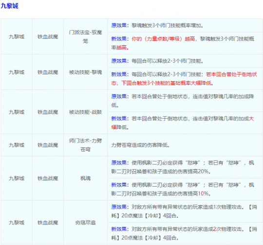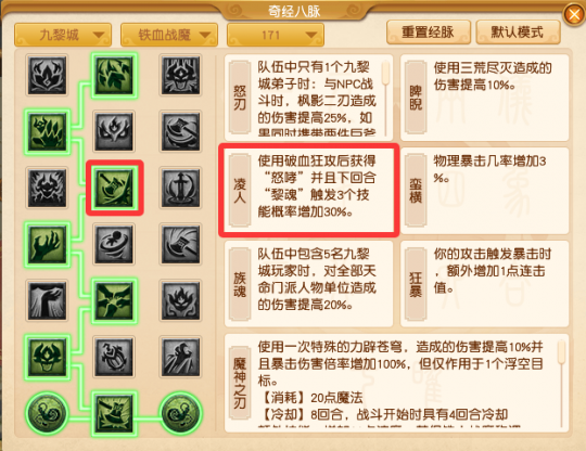 随着门派调整正式落地,总体削弱,不过实际pve与pvp经脉点法与此前基本一致,没有什么变化。值得注意的是,门派调整链接页面的一条红字【说明:也许在未来某一天,九黎城也会放下蚩尤战士的矜持,拥抱更多的少侠......】 (注:本文为基于目前测试版本做出的个人推荐,如全服版本出现微调,请留意论坛攻略版块的后续更新。) 1、pve经脉说明 任务常规点法为211121或212121。 第一层、第二层和第四层的怒刃、睥睨和蛮横,很直观的增加了枫影二刃与三荒尽灭的输出及暴击率,点了即刻生效;第五层选择族魂虽然没什么用,但是如果选择擎天,铁火双扬开局就会有6回合cd,对局快节奏的任务而言反而是反面效果;第六层暴击增加连击值可以让次回合刷三技能的概率增加,而且与第四层的蛮横更适配;值得注意的是第三层,如果有破血,可以选择凌人,配合愤怒符的首回合破血以及次回合大概率三技能加怒哮,可以大幅提升任务效率,如果没有破血那就选择飞扬。 2、pvp经脉说明 pvp中最常见的点法即为123232。虽然第一层的枫魂降低了10%的后续伤害,但依旧为必点技能,枫影三荒接力劈小连招的核心经脉;关于第六层,虽然穷寇尽追获得了加强,但是依旧不足以代替驭魔笼的效果。 此外,诸如帮战双龙等快节奏pvp,第一层可以选择右丹的震怒,开场获得怒哮直接三荒力辟打快攻。 本次门派调整对九黎影响颇大,倒地后几乎彻底失去进攻能力,带有九黎的队伍该如何思考对战决策是一个新的难题。此外,尽管牺牲属性也推荐堆蓝字奇袭法术,这样一来,即便倒地,若触发奇袭法术,你也是1+2=三技能,依旧可以一套小连招。 特别说明:本文仅代表个人观点,不代表游戏或官方论坛立场。 叶子猪梦幻西游玩家群:1群 325703083 (2000人),2群: 330102322 (千人);3群: 424986787 (游戏疑难解答);4群: 330518295 (商人物价);5群: 1063086037 (疑难解答);6群: 1045753197 (春心萌动);7群: 787195090 (活跃互动);8群: 720665628 (全民PK) [编辑:百晓生]