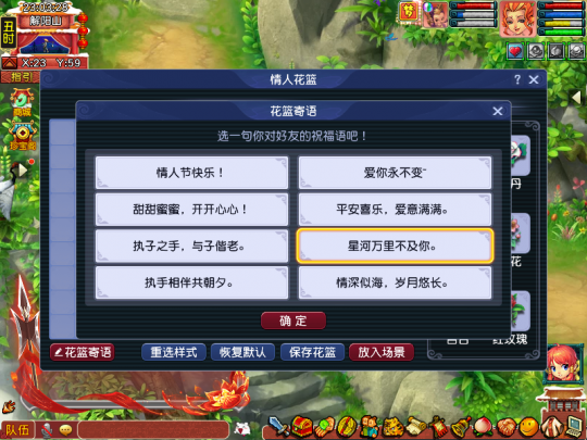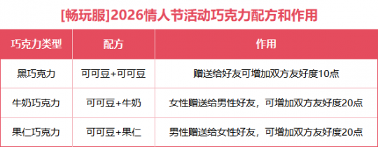 畅玩服2026年的情人节活动将在2026年2月12日12:00开始,持续4天时间。各位少侠若是有心仪对象可以跟对方一起做任务,互相赠送巧克力提升友好度,领取节日特殊称谓。 专题页链接https://xyq.163.com/my/2026/qrj/ 下面给大家介绍一下活动玩法。 环任务:非常有特色的小游戏 抱抱大作战是游戏中的环任务,大于等于30级的异性两人组队后,可以到长安城(231.117)找情缘仙子领取任务。完成任务可获得经验与储备金奖励,还可获得制作浓情巧克力的原料。另外,完成第5环任务还有概率获得宝石、金银锦盒等物品奖励。 环任务一共有5环,前面4环是随机小游戏(不会重复),最后1环是固定战斗任务,难度不大,详细如下: 1、默契心相印(翻牌子):一共有6个牌子,分别是3组不同的门派Logo,只要翻出两个相同的门派Logo,它们就会消失,翻完3组即可通关。 攻略:门派Logo的位置不会改变,多翻几次就能记住位置。当第一位少侠选择好了位置,另外一位少侠选择跟他相同的门派Logo即可。 2、双人拓印(画画):根据左边的提示,队长和队员分别在相应颜色位置画画,完成即可通关。这个任务就是字面意思,非常简单,不展开了。 3、太平鼓(按键):按下鼓点对应的方向按键,即可踩中鼓点。在限定时间内,双方累计达到150分即通关,未达到150分即失败。 攻略:游戏开始后,会出现如下图画面,上下左右的箭头会从左往右慢慢移动,当到达黄点位置(即图中红色圈圈)的时候,根据箭头方向按键盘对应的键即可。 箭头移动比较缓慢,根据箭头方向按就可以,两个人按很快到达150分。 4、谜语仙子(战斗猜怪):进入战斗画面,主怪是芙蓉仙子,小怪是花妖,伤害比较低,需要猜对谜语或者将怪全部击杀。 攻略:主怪会给出一个谜语,谜底则是四个小怪中的一个,猜出谜语并将对应的小怪击杀,那么剩余的怪都会逃跑。不想猜谜语的少侠,可以将怪全部杀完也能通关。 5、心心相印(默契答题):NPC会问你一个问题,并给出选择,双方需要选到相同的答案才算答对,默契答对3题即可通关。 攻略:切换到队伍频道,答题时将自己的选择打出来发出去,让对方选择即可。 6、最后战斗:主怪会地狱烈火,法防低没法抗会烧得比较痛。小怪都是普通攻击,伤害较低,没有威胁。 攻略:主怪的血量非常多,可以被封印,回合结束不会解封。满修的少侠杀起来非常轻松,修炼低的少侠需要注意,分下面三种情况: (1)有封系门派可以将主怪封印,人物群秒,攻宠点主怪; (2)有辅助门派,没血就加,难度不大; (3)两人都是输出门派,集火主怪即可。 环任务的难度不大,以小游戏为主,大家每天可以做一轮(5环),拿到制作巧克力材料即可。 制作巧克力:快速增加友好度 少侠每日做前5环任务和达到一定活跃度后能获得浓情巧克力材料(可可豆、牛奶和果仁),在情缘仙子处可以制作浓情巧克力。 巧克力的配方和作用如下: 少侠可以分配好材料,女方制作牛奶巧克力给男方,男方制作果仁巧克力给女方,这样能快速增加友好度。如果想同性之间增加友好度,那就选择黑巧克力。 赠送巧克力:领取专属称谓 男女双方赠送浓情巧克力达到一定次数后,可以与友好度≥1000的异性好友在情缘仙子处领取情侣专属称谓。巧克力送给好友的次数均为个人送出份数,所以在制作巧克力的时候要注意,别做错了,不然就只能和其他玩家交易了。 情人花篮:表达心意 活动期间,少侠的每日活跃度达到100后,可以获得趣味道具【情人花篮】,使用情人花篮可设计自己的专属图案,将花篮摆放在场景中,或赠予心上人,表达自己的心意吧! 情人花篮使用后可以选择喜欢的图案,点击“确定”后可以进入花篮布置区。 花篮布置区可以在右边选择不同的花进行设计。 点击左下角的“花篮寄语”可以选择一句你对好友的祝福语。 少侠设计好情人花篮后,选择“保存花篮”,然后选择“放入场景”即可完成场景布置,花篮需要在野外场景才能布置,主城不可以布置。另外,设计好的花篮也能赠送给好友,可以额外获得一次奖励。 不羡鸳鸯不羡仙:节日优惠 2月14日情人节当天,有情人在月老处结婚享5折优惠(仙玉婚礼为6.5折),使用喜轿游长安享8折优惠! 畅玩服2026年情人节活动设计得非常有意思,适合cp朋友一起游玩。各位少侠若是遇到喜欢的对象,可以在活动期间表白哦! 叶子猪梦幻西游玩家群:1群 325703083 (2000人),2群: 330102322 (千人);3群: 424986787 (游戏疑难解答);4群: 330518295 (商人物价);5群: 1063086037 (疑难解答);6群: 1045753197 (春心萌动);7群: 787195090 (活跃互动);8群: 720665628 (全民PK) [编辑:百晓生]