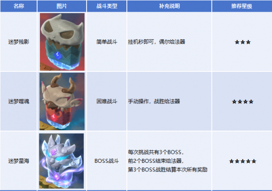 梦魇幻境是梦幻西游畅玩服里比较有特色的单人玩法,它不仅有80级环装、高级兽诀等丰富奖励,还极具策略性。同时,少侠只需要挤出部分碎片时间便可体验。 进阶层数越高,奖励越丰富。今天,小帅就给大家分享一下梦中梦·9的一些心得技巧。 一、快速过一遍基础知识 开启条件:服务器开服时间≥31天,角色等级≥50级的单人玩家。 开启方式:前往长安城(450,217)寻找绘梦师,可消耗10仙玉或使用400点副本积分开启。 玩法设定:目前赛季处于天火赛季,未飞升的玩家与助战会被统一设定为145级,召唤兽150级;已飞升玩家统一设定为155级,召唤兽160级。换句话说,即使装备是环装、宝宝等级不够,系统也会配置成能刷任务的属性助你通关。 玩法奖励:每周第一次体验时,可以获得一次全额奖励;第二次、第三次体验时奖励会衰减且不会获得物品奖励。赛季内首次通关梦中梦1、3、5、7、9时,可获得对应级别的首通奖励。 二、通关难度9的准备工作 1、将灵根升级到满级(10级) 每成功挑战一层关卡,角色会获得不少梦境灵气。灵气可以提升灵根等级,灵根影响着队伍成员的血、防、伤害等属性。 心得:基本上灵根等级>难度级别,打赢BOSS的几率很大。如果想要打赢难度9,建议每周的3次玩法全部刷满,第一时间将灵根升级到10级。 2、关卡之门的选择 关卡之门一共分为两个类型:分别是战斗关卡和非战斗关卡。 ①战斗关卡 出现迷梦星海关卡的时候,只有这一个关卡选项。其他的关卡类型则需要判断选择优先级,困难战斗选择优先,简单战斗最后考虑。当两个战斗类型的门和非战斗关卡的门同时出现时,可以参考星级的优先顺序,下文会分享选择思路。 ②非战斗关卡 2个5星的门不会同时出现,碰到需要优先选择。 4星的门分别是嬉戏之森和困难战斗,可以根据补充说明的内容结合当时挑战的状态进行选择。如果法器少或者低级法器作用不大,就选择困难战斗;如果法器本身比较多或低级法器作用比较大,就选择嬉戏之森。 3星的门优先选择援助之地,毕竟简单战斗不一定会给法器,但援助至少给一个额外的助战,这对于后续的玩法能提供选择的余地。 2星和1星看情况进行选择,由于未知之地和简单战斗都是有可能获得法器,这2个门按理说应该都归属于3星。但是,未知之地有部分互动玩法可能出现失败的情况,从获得法器的角度来看,存在一定风险。因此,优先程度需要往后排一点。 3、筹备应对特色怪物的召唤兽 以龙龟、蝎子精、变异净瓶女娲和变异踏云兽这些怪物为例,它们都有金身的效果,有的怪物甚至有多层金身。 这个时候就需要一只配速宝宝破金身了,可以是速度快的连击宝宝高神宝宝,也可以是速度快的大法宝宝。 如果觉得梦魇幻境的专属宝宝弄起来成本太高或者太麻烦,也可以考虑在部分环节用大唐这种一个回合造成多次伤害的助战NPC。 4、法器的最佳“组合拳” ①每个回合会产生护盾+有护盾时提升输出。 ②队伍保证2个回复门派+神木面具的受到治疗就提升输出。 ③面伤阵容不够时,召唤物前来相助。比如打蝎子精BOSS的偶数回合时,对方有9个小怪且各带一层分身,此时龙宫群秒配合这个法器便能做到清场效果。 ④每个回合提升盾的数值+每个回合结束根据护盾值造成伤害,一直叠状态。 除了上述“组合拳”之外,还有一些需要收集的通用法器。比如七杀、缚龙索、罗汉珠、聚妖铃、飞剑和烽火狼烟这些法器,能大幅度提升输出。 同时,一些功能型和保命型的法器也需要收集。比如嗜血幡可以出手2次,不管是辅助回血还是输出多次出手;比如梦云幻甲、救命毫毛这类关键时刻能救命的法器,总能给胜率增加一层保障。 三、梦中梦·9实操演练 首先,入场后确保灵根培养到10级,提升过关率。 再选择合理的阵容,小帅这次使用的是五庄、普陀、化生寺、龙宫、盘丝(自己)。这个阵容既能保证3个回血点,又能保证有封、有物理输出和法系输出。 接着跟着任务提示和上述的关卡选择分析继续做任务即可,这里提一嘴大家可能会在梦中梦·9遇到的情况:碰到一次援助之地、两次集市之地和一次铁匠。 花钱心得分享: 1、援助之地建议仅邀请一名助战即可(不要额外花钱邀请!!) 2、两次集市均购买镇店之宝,每次消耗200银币(如果前面援助之门额外花了钱,可能会导致第二次购买镇店之宝余额不够) 3、遇到铁匠时可以给予对方低级法器,对方有几率返回高级法器或直接损毁。如果低阶法器好或者自身法器数量不多,就不要去换! 部分战斗环节需要一些技巧,比如变异大力金刚会横扫千军·破(扫完之后不休息),而大部分怪都可以封印,可以在适当的时候封印一下,打断节奏;比如机关鸟合体环节,如果输出不够,可以选择带大唐、五庄和攻宠这种点杀能力强的阵容,专心清掉一只前排怪。 嬉戏之森大部分小游戏都有容错的机会,下棋比较特别,建议优先释放间隔的箱子,让对方放出相邻箱子里的怪物。这样操作,可以给自己更多的选择(躲到一边或吃掉对方)。 非本周首次挑战的情况下,有一次重来的机会。每一次的失败都有原因,大家可以参考上述的一些心得和技巧,重新整理策略再开打。 分享一下本次挑战的法器选择,最终打赢BOSS有两个关键因素:①BOSS为双生怪,难度相对来说会比蝎子精容易一些;②法器的输出面伤比较稳定,能造成2个BOSS同时倒地。 总而言之,要通关梦魇幻境梦中梦·9