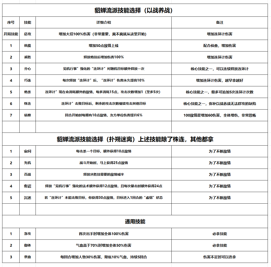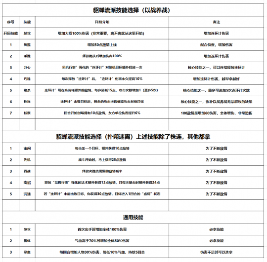 梦幻西游山河画境第六赛季「三国」上线后便收获众多玩家喜爱,四大武将各有特色,技能设计高度贴合人物本身的经典特质。其中貂蝉作为群阵营的决胜流派核心,是本赛季操作最简单、成型最稳定的物理输出流派,核心围绕连环计无限大招机制展开,全程只需ALT+Q即可轻松清场战斗;玩法依托敌情资源循环,搭配锦囊实现持续大招释放,兼顾单体点杀与群体输出能力,堪称三国赛季版本答案,十分适合新手、休闲玩家与追求无脑速通的玩家选择。 一、核心机制(必懂) 1.核心输出技能 连环计:貂蝉流派唯一核心输出技能,为决胜系大招,依靠敌情资源释放,搭配对应锦囊可实现无限释放,是全程贯穿的核心输出手段。 2.核心资源 敌情:貂蝉流派核心能量,用于释放连环计;通过技能、锦囊效果回复,满额即可释放大招。 二、核心道具搭配(锦囊+妙计+组合妙计) 1.锦囊选择(两大主流,按需选择) 貂蝉流派锦囊分为首选稳定型与备选看脸型,适配不同玩家习惯:优势:释放技能后持续回复敌情,可实现连环计不间断释放,输出稳定、不看脸。缺点:未拿到株连技能前无群攻能力,清理群怪效率偏低。 优势:每过一关有概率叠加连环计攻击次数,最高可叠至14次攻击,自带群攻效果,不怕群怪。缺点:叠加层数极度看脸;需要大量敌情回复技能,会压缩输出技能位置。 2.妙计镶嵌(分顶配/平民,清晰直白) 以战养战·妙计搭配顶配配置:3个3级幸运疾驰+ 5个3级幸运无双 释放6次连环计后即可无限大招,5个3级无双提升90%大招伤害,爆发拉满。 释放3次连环计即可无限大招,成本低、成型快,可稳定通关进阶42层。 扑朔迷离·妙计搭配顶配配置:6个3级幸运疾驰+ 2个3级幸运无双 开局即可放连环计,兼顾敌情回复与36%大招伤害,综合能力最强。平民配置:8个2级幸运疾驰(与以战养战通用) 打造简单、投入低,仅比顶配少36%伤害,性价比极高。 3.组合妙计 总攻:开局必选,直接提升连环计100%伤害,相当于开局双倍输出,大幅降低前期难度。 三、核心技能选择(分锦囊适配,必拿明确) 以战养战锦囊(纯输出,无需敌情回复)核心思路:全程只拿输出技能,舍弃所有敌情回复类技能。株连:解锁群攻能力,弥补以战养战最大短板。绝杀:强化点杀与爆发,进一步提升输出上限。 扑朔迷离锦囊(输出+敌情双兼顾)核心思路:必须搭配敌情回复技能,才能维持无限大招。 其他锦囊(熊虎之勇,见多识广,时运在我,老而弥坚等等)妙计选择:8个2级的幸运疾驰,增加108%的敌情回复核心思路:选技能要兼顾输出技能和回复敌情必拿核心技能:沉迷、统揽、百战、株连、绝杀。 备注:只要舍得刷技能,没有以战养战和扑朔迷离,一样可以做到无限连环计+多段群秒输出 四、召唤兽选择(基础标配,适配全阶段) 貂蝉召唤兽体系固定,兼顾增伤、输出、抗伤、破金身、救场,是冲层必备配置:万血鼓舞宠×1 进阶36层必备,可大幅降低怪物防御;万血加点可扛住野生吕布第一回合伤害。 全力夜舞倾城×3 前期核心补伤,应对山贼、泡泡、黑山老妖、猴子精等前期怪物。 配速万血血宠×2(推荐1只带壁垒击破) 优选树苗/净台宠;壁垒击破每回合可破2层金身,优于死亡召唤、惊心一剑。 龟速高级隐身宠×1 用于尸体战救场,拉起人物可连续施法两回合,节省药品。 普陀山孩子×1 第三关山贼首领核心输出;可吃高魔心、高法暴、高法连加成; 建议用老版可穿装备孩子;69级不可用(需80级解锁五行法术)。 五、装备&灵饰&玉魄搭配 1.特技选择野兽之力:提升自身10%伤害(部分情况下无效) 2.装备选择衣服、武器:国标主属性即可,无需追求特技,性价比拉满。 3.灵饰选择前排灵饰:物理暴击(扑朔迷离流派刚需,提升密诏触发) 4.玉魄选择 六、实战操作指南(全程无脑ALT+Q) 核心操作思路 开局叠敌情→快速释放连环计→达成无限大招→全程ALT+Q清场。 关键流程开局:直接使用总攻,双倍伤害起步。以战养战玩法:先放3–6次连环计完成暖机,之后无限大招。扑朔迷离玩法:边打边叠层数,靠敌情技能维持大招循环。技能选择:场景应对:群怪:以战养战需拿到珠链再进;扑朔迷离可直接清。BOSS战:无限连环计直接轰炸,无需复杂操作。 七、最终BOSS针对性打法 貂蝉成型后为无限大招碾压,所有BOSS均可轻松通关:天女:第一回合有黄盾点杀黄盾,没黄盾点杀右边妙华天女(如果打不死,沉迷她还可以降低妙华天女50%的伤害)。外星人:第一回合防御,第二回合使用连环计持续输出,轻松碾压。(如果是以战养战的貂蝉,第一回合可以使用连环计,沉迷外星人,降低外星人50%伤害,增加我方单位的存活率)蝎子精:配速宠先手破金身,一回合秒杀。张角:貂蝉流派的一生之敌,配速召唤兽可以使用回春龙沙散解除张角的封印,人物使用连环计输出,注意第三回合必须要击杀张角本体或者破除掉张角的蓄力。吕布:第一回合全体防御,第二回合开始人物使用连环计点杀吕布,召唤兽全体输出,点杀吕布,破除吕布的防御。(扑朔迷离的貂蝉,技能必拿沉迷和泰山) 八、通关核心技巧总结锦囊选择:求稳选以战养战,想群攻选扑朔迷离。妙计核心:平民统一8个2级幸运疾驰,低成本通吃。技能核心:以战养战纯输出;扑朔迷离必带回敌情。召唤兽核心:鼓舞、夜舞、壁垒、普陀孩子缺一不可。操作核心:成型后全程ALT+Q,真正无脑速通进阶42。 九、结束语 貂蝉作为山河画境三国赛季的版本答案,凭借操作简单、输出稳定、成型快