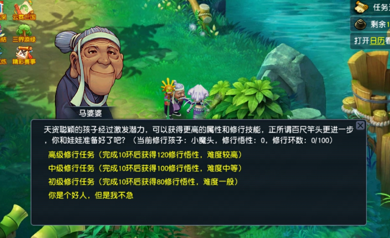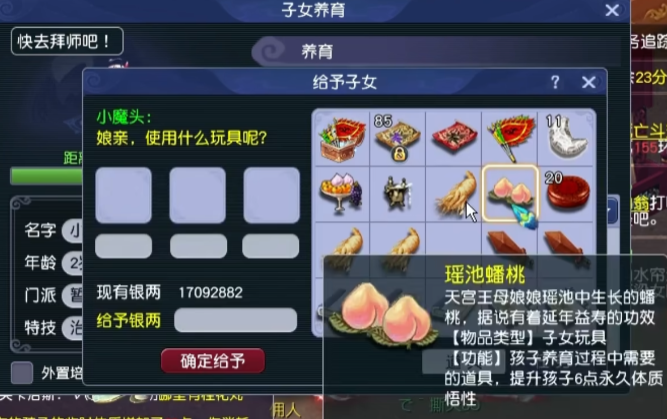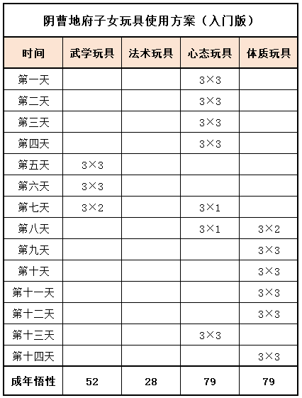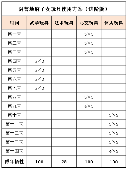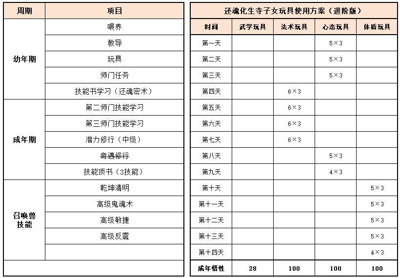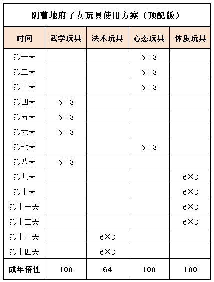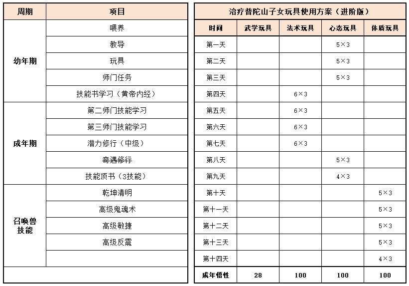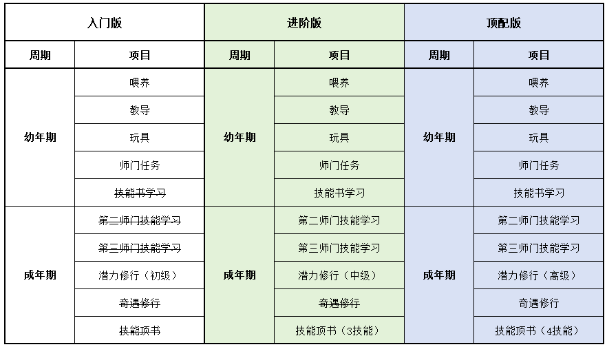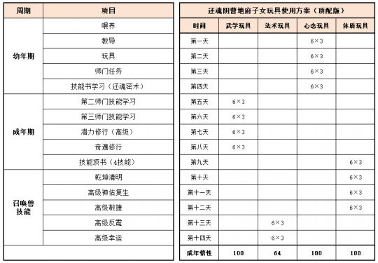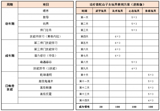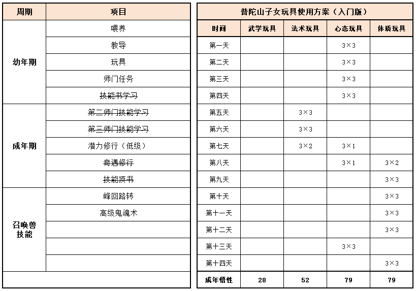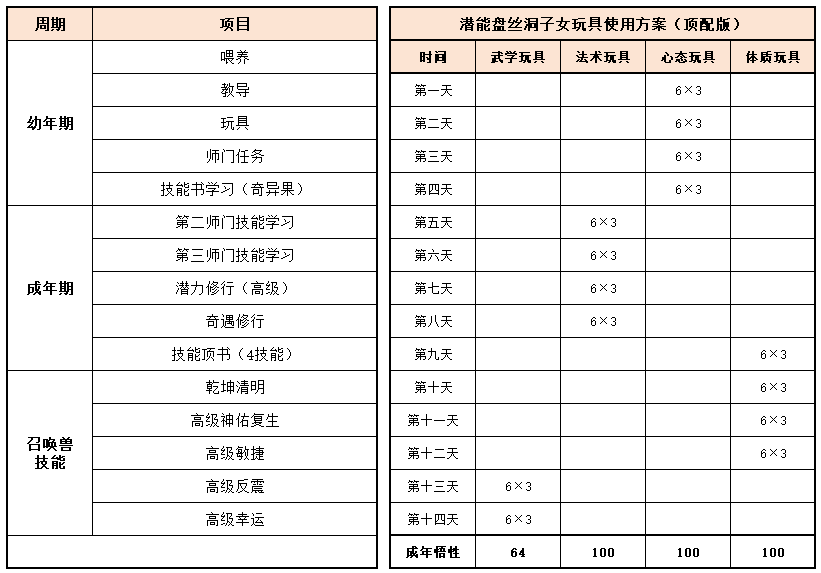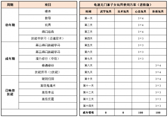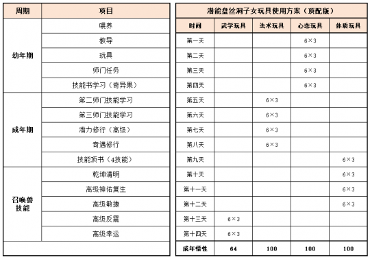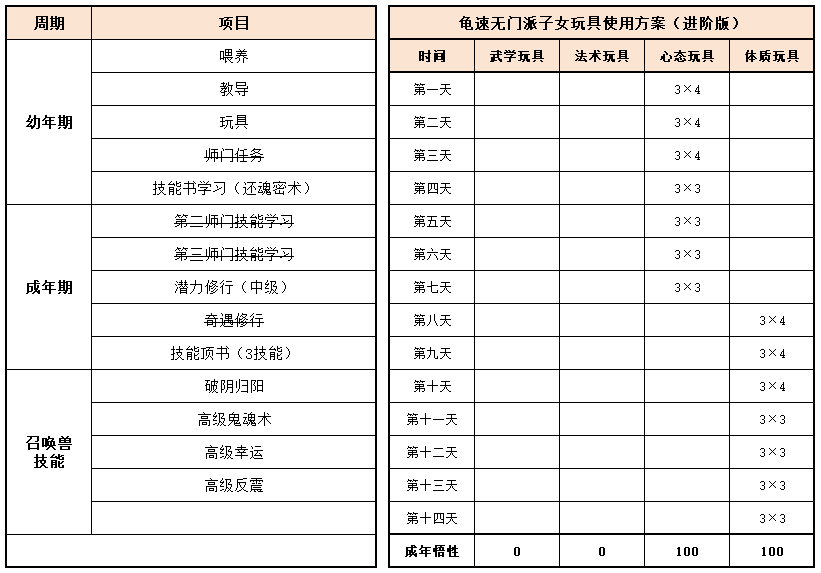 《梦幻家园》资料片登陆畅玩服后,不少小伙伴都在纠结:子女到底该怎么选?幼年期该怎么养?成年期该怎么提升?今天小编就把子女养育全流程一次性讲透,从幼年期到成年期,一文全覆盖,看完直接“抄作业”! 子女养育分待产期、幼年期、成年期三个阶段,幼年期、成年期是影响子女战力的核心阶段。幼年期 幼年期共14天,核心是喂养、教导、玩玩具、师门任务、特技学习,每一步都影响子女最终成果,现在就对每个节点展开讲述: (1)喂养 点击“喂养”,给予子女指定烹饪、三级药,提升临时体质悟性,每日喂养无上限。 在每天结束时,如果临时体质悟性>永久体质悟性,且临时体质悟性>80,则永久体质悟性+2。 每天约3个烹饪或三级药就能把临时体质悟性提到100,千万不要忘记!教导 点击“教导”,子女会向玩家提出问题,根据答案的不同提升对应的临时悟性,每天最多可进行8次教导,每次教导消耗50点活力。强烈建议每天都将子女的4种临时悟性提升到100%。 (3)给予玩具 给予子女玩具可以提升永久悟性,每日最多给3个玩具。子女玩具可在长寿村马婆婆处购买,杀二十八星宿也有概率掉落。 以阴曹地府子女为例(拜师需武学≥50,心态≥50),有三档玩具使用方案供玩家参考: 入门版 入门版玩具使用方案可以保证子女在第14天结束前,武学≥50,心态≥50,恰好能拜入阴曹地府门派。 进阶版 进阶版玩具使用方案可以保证子女在第14天结束时,武学、心态、体质悟性全部达到100,成长、体力资质、防御资质、速度资质都达到理论上限。 顶配版 顶配版玩具使用方案在进阶版方案的基础上,兼顾法术悟性的提升,使得成年子女能够有更高的法防和蓝量,进一步提升子女在战斗中的抗性和续航能力。 (4)师门任务 子女拜师后,可完成14个子女师门任务,完成任务将提升子女的2个悟性值,可突破100点悟性上限。 子女师门任务主要是帮师傅寻找物品,包括暗器、花卉、乐器、魔兽要诀。(子女师门任务可取消,取消任务将减少一次增加永久悟性的机会) 根据玩家的实际情况和预算投入,有不同的培养方案: 入门版 只做寻找暗器、花卉、乐器类任务,如果需要提交魔兽要诀则取消任务。 进阶版、顶配版 进阶版和顶配版推荐完成所有类型的师门任务,悟性拉满,在成年时拥有最佳的资质和成长。 (5)特技学习 子女出生8天后,即可学习特殊技能,学习时需要消耗一本指定的特技技能书。 玩家可以根据实际需要和预算投入选择合适的特殊技能书,当然也可以不学习特殊技能。 2、成年期 子女成年后初始潜力点为等级×2,初始技能为第一师门技能、1个随机低级召唤兽技能、特殊技能(学习特技技能书获得)。 子女成年后可通过潜力修行、奇遇修行、师门技能拓展、召唤兽技能拓展进一步变强,让潜力点、技能再获提升。 (1)潜力修行任务 成年期子女,可找马婆婆开启潜力修行任务。潜力修行任务以10环为一组,完成任务可获得修行悟性。完成100环潜力修行任务后,子女将根据修行悟性,获得对应的属性点和随机修行技能。 经小编个人统计,完成潜力修行任务可获得的额外属性点如下: 额外属性点=子女等级×修行悟性×0.003 以160级子女为例,100环中级修行任务可额外获得480点属性,100环高级修行任务可额外获得576点属性。 各级修行任务内容如下: (2)奇遇修行任务 成年14天后的子女,若已经完成潜力修行,可以找马婆婆领取奇遇修行任务。 完成全部5次奇遇修行任务后,可获得50点属性点和2项资质提升100点(根据门派提升)。 (3)师门技能拓展 等级≥80级的子女可找到门派师傅学习第2个技能。 学习第二师门技能需完成一系列任务,包括寻人、寻物(强化石、变身卡、1本随机子女特技书)。 等级≥100级的子女可找到门派师傅学习第3个技能。 学习第三师门技能需要提交1套子女特技书(潜能果、蚩尤武诀、黄帝内经、还魂密术)。 (4)召唤兽技能拓展 通过打书界面,选择给子女打书,可替换1个子女已经拥有的召唤兽技能,并有几率额外获得一个召唤兽技能。子女最多拥有4个召唤兽技能。 小贴士:子女“顶书”阶段使用价格较低的神佑复生、隐身、鬼魂术兽决,将显著降低“顶书”成本。 3、养育方案汇总 小编按入门、进阶、顶配制定了三档养育方案,少侠按需选择即可,具体步骤上文已详细说明。 畅玩服子女目前可以拜入15个门派,小编精选6款热门方案,任务、PK全覆盖! 1、入门版——普陀山子女 实战效果:入门版普陀山子女极其适合任务玩家,“杨柳甘露”能解决任务中队友倒地无法拉起的痛点;“峰回路转”使子女在登场时就能给全队回复气血。特殊技能和第二、三师门技能可以不学习,从而进一步降低养育成本。虽然只携带1本高级鬼魂术兽决,但凭借极高的资质也能让普陀山子女在任务中有不俗的生存能力。 2、进阶版——龟速无门派子女 实战效果:龟速子女是最特殊的存在,只有不拜师的子女才是真正的龟速(拜师要求武学或法术≥50,会使得速度资质有所提升),这导致龟速子女比其他子女少了3个师门技能。 龟速子女往往是为了救起倒地单位防“守尸”而存在,所以特殊技能必选还魂密术;召唤兽技能以生存技能为主,例如高级幸运、高级反震。 值得注意的是,龟速子女的养育比其他子女更让家长“费心”。在养育环境要避免因答错题而提升临时武学悟性或临时法术悟性,否则子女就会不够“龟”。 3、