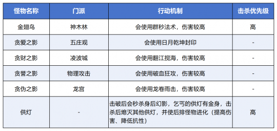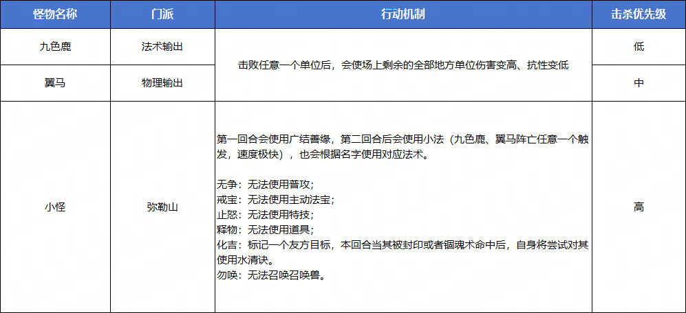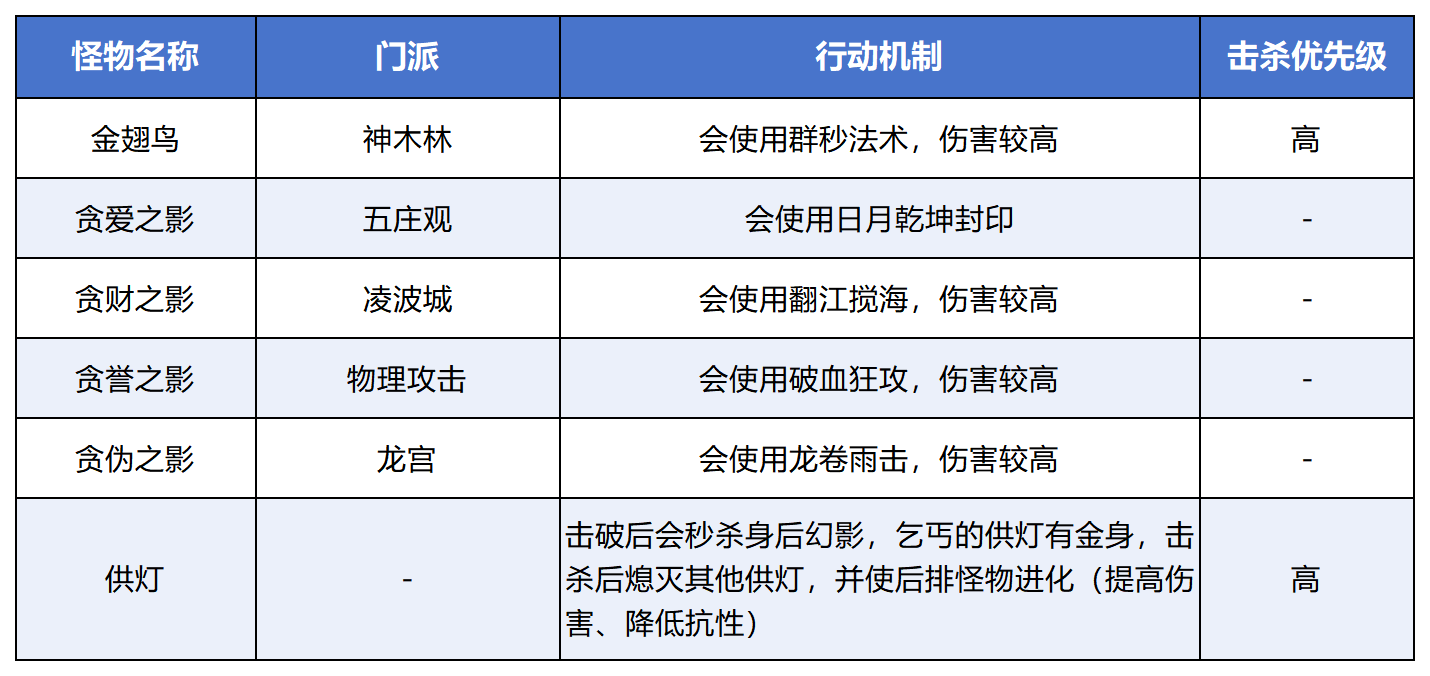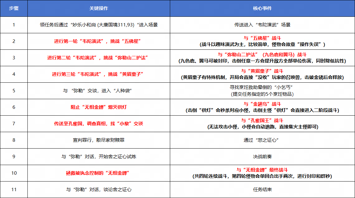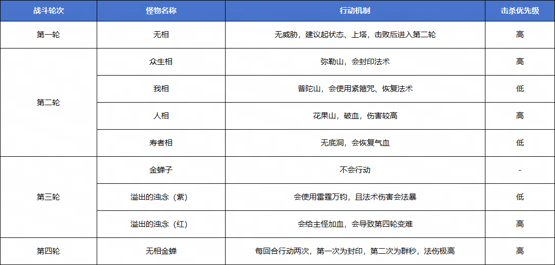 “佛宝非宝,能用慈悲方为宝,无相非相,不离众生始见相。” 时隔三年,继“魔息角之怒”后,我们再度推出全新神器任务·起“人种袋之悟”,并在上周开启了部分服务器的测试。 随着“人种袋之悟”已经全服放出,许多少侠反馈非常需要一份攻略指引,以便各位少侠能更轻松的通关全新神器任务。 小编也是在上周第一时间进入测试区,整整体验了一周,才写下这份全新神器任务·起“人种袋之悟”的详细攻略,话不多说,各位少侠快来查收这份攻略吧~ 全新神器任务·起“人种袋之悟”战斗之外的环节流程较少,还对需要的道具物资、任务动线进行了适当的减负。各位少侠只需掌握怪物战斗机制,就能轻松通关。 “人种袋之悟”的背景故事同全新天命门派“弥勒山”密切相关。因此在任务过程中,大家会碰到不少来自“弥勒山”门派的战斗怪物。 “人种袋之悟”的任务领取条件同其他神器一致。 需要注意的是,该神器的所有战斗均有法伤较高的怪物,且多为面伤输出,小编也是建议各位少侠在挑战的时候,队伍至少携带1个恢复门派和1个“罗汉金钟”特技,将有助于降低战斗难度。 各位少侠在通过“妙乐小和尚 (大唐国境311,93)“进入场景后,将与“五佛星”、“九色鹿”、“黄眉童子”进行战斗。战斗结束后,给予“小乞丐”所需要的烹饪物品,再进入“金翅鸟”战斗和“孔雀国王”场景,通过全部考验后就将进入最终决战。 在基本了解“人种袋之悟”的全部流程之后,小编将为各位少侠详细介绍具体环节流程的各大攻略要点。 1、突破“韦陀演武”首战 切入第一场战斗,我们会发现对战NPC和我们玩家一样,都是“角色+召唤兽”的形式,大家可千万别被这阵势给吓到,其实这场战斗较为简单,有心的少侠还会发现,对面的敌人有时会“操作失误”,还会在当前发言指挥,整体氛围比较轻松。 前排“隐攻”会逃跑,各位少侠只需点着输出较高的须弥(涂山瞳造型)和力破(雷鸟人造型)击杀即可。 其中“慧如”的门派是化生寺,在气血较低的情况下会使用“舍生取义”舍生自己,各位少侠可以集火争取一回合完成点杀,防止他持续回复。 2、“韦陀护法”第二战,挑战“弥勒山二护法” 在第二场战斗中存在一个特殊的机制:当各位少侠击败九色鹿、翼马中任意一个单位时,剩余的全部敌方单位都会获得“伤害提升、抗性降低”的状态。且九色鹿、翼马可被封印,推荐各位少侠优先击杀小怪(速度快、法伤高),之后再击杀九色鹿、翼马,这样就会最大限度的降低战斗压力,更加轻松通关。对自己的伤害和抗性有自信的少侠,也可以直接击杀翼马或九色鹿,让剩余的敌方单位降低抗性,随后更高效率清理小怪。具体通关策略,各位少侠可视自己队伍的情况而定。 3、“韦陀护法”第三战,挑战“黄眉童子” 前往韦陀演武(139,91)处同黄眉童子对话后,进入第三场战斗。本场战斗的难点在于黄眉童子首回合会召唤金铙,金铙会吸取所有人物单位的召唤兽(温馨提示,召唤兽被金铙“吸走”,是不会损失忠诚度和寿命的哦!)面对金铙,各位少侠往往有四种应对策略,分别为: 1、在战斗前收回召唤兽,直接让黄眉童子“行动失败”,进入战斗后直接召唤宝宝; 2、正常携带召唤兽出战,金铙吸走召唤兽后,集火攻击金铙,这样会把吸走的召唤兽全部放出来; 3、正常携带召唤兽出战,金铙吸走召唤兽后,再召唤一批召唤兽出来继续战斗; 4、正常携带召唤兽出战,金铙吸走召唤兽后,无视机制,直接输出。 小编在这比较推荐前两种策略。若各位少侠采用第一个不让召唤兽参战的策略,还会触发黄眉童子的彩蛋对话,可以获得一点成就点!若采用第二个策略,当召唤兽被金铙吸走后,玩家集火击倒金铙,被放出的召唤兽还会携带“增加物理/法术伤害”的状态,将大幅提升召唤兽的战力。 另外需要注意,本场战斗的怪物伤害较高,尤其是主怪黄眉童子,会使用“短软狼牙棒”进行秒五的物理输出,建议优先集火主怪,之后只要注意恢复保持血线,即可轻松通关。 4、寻人、寻物,简单推进任务流程 接下来各位少侠需要同无相金蝉、弥勒、绣女、书生、富商等NPC对话,完成所有对话,并将准备好的烹饪物品交给小乞丐。 随后,继续与绣女、书生、富商等NPC对话,对话结束后进入灯堂祈愿,触发第四场战斗。 5、第四战,阻止无相金蝉熄灭供灯! 第四场战斗小编推荐两种打法: 第一种为按顺序集火点杀前排供灯,当供灯被击杀后,对应供灯后的怪物会直接死亡;后排怪物可封印(推荐封贪财或贪爱,无法封印主怪),若队伍有余力,可在集火前排供灯的同时封印后排恶念,这样将大幅降低本场战斗的难度。 攻击顺序推荐“绣女→富商→书生→住持”。需要注意的是,对于抗性较差的队伍,切勿上来就集火中间的乞丐的供灯:乞丐的供灯不仅有金身,而且如果率先击破乞丐的供灯,则会熄灭前排所有供灯,直接让后排的怪物进化为二阶段,怪物伤害将得到大幅提升。 第二种打法则与第一种打法完全相反,就是优先击败乞丐的供灯。 在上面我们提到过,若提前集火击败乞丐的供灯,会加速战斗进程,提前进入二阶段。虽然后排怪物的伤害将会得到提升,但同时抗性也会降低。因此如果各位少侠的队伍输出高、抗性高,也可以采用这一打法提高效率、快速过关。 6、寻人、对话,继续推进任务流程 接下来,各位少侠需要同无相金蝉、弥勒、孔雀