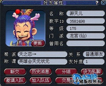 第三名:游天儿 服务器:星海湾 门派:龙宫 满级时间:2011年7月5日 武神坛最好成绩:甲组冠军 简介:星海湾第一龙宫,征战武神坛数十届,星海湾的代表人物。在龙宫最低谷的时候仅有的几个坚持下来的,全服第一个满级龙宫,实至名归。