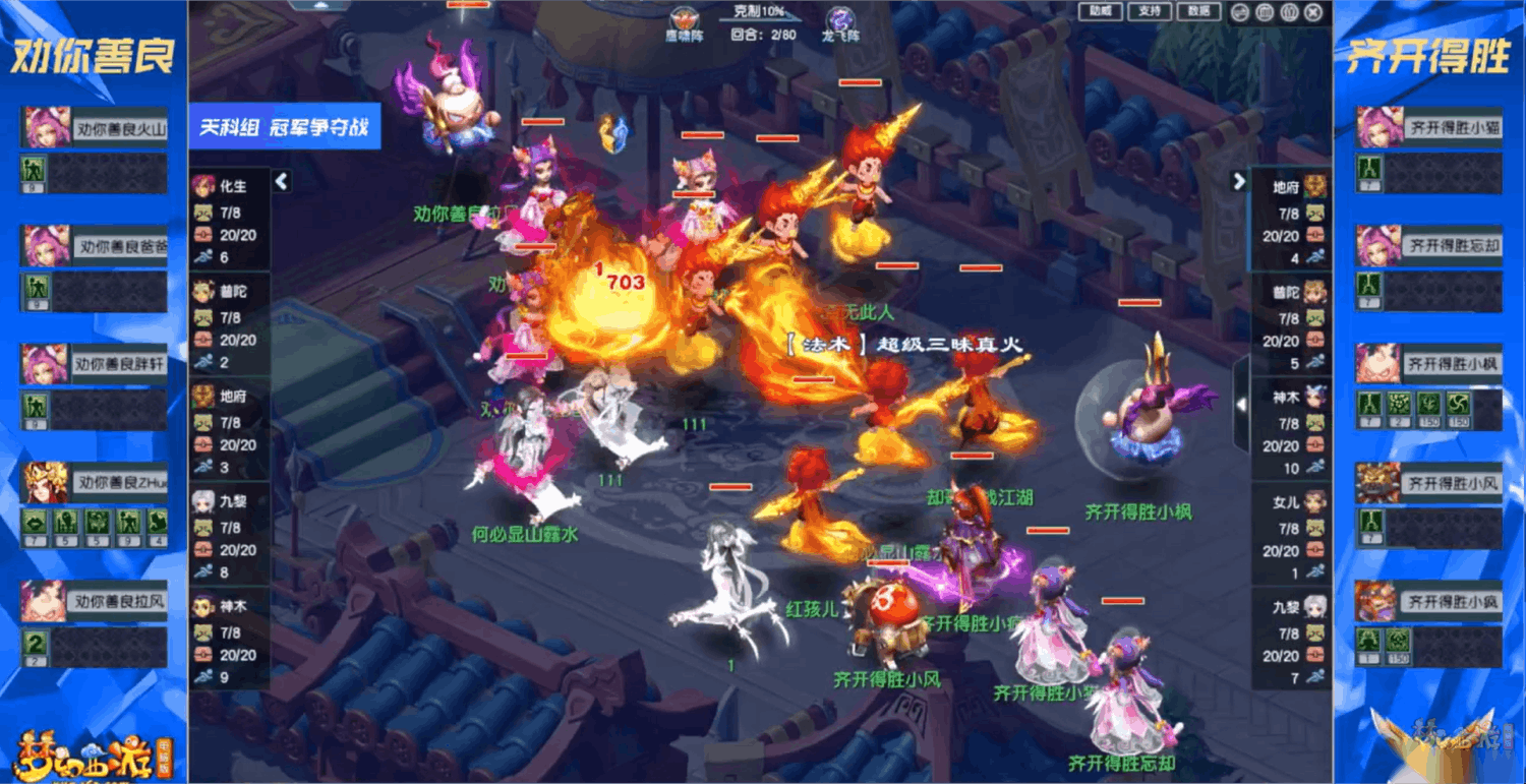 8月9日至10日,当盛夏遇上群雄逐鹿,双份热情被点燃。X9精英争霸赛第四赛季的赛场上,来自6个组别的12支战队在这里绽放出最闪耀的光芒,与你一同“燃”爆夏日。最终,6支队伍脱颖而出,荣膺冠军宝座。让我们一起回顾他们的冠军之路! 精锐组冠军:看图说话 禁选阶段,【四海一家】禁用了对手的阴曹地府+九黎城,【看图说话】则是禁用了对手的女儿村+九黎城。在精锐组别,九黎城的优势被无限放大,【四海一家】战队甚至携带了3九黎城参战。 观战方【看图说话】:女儿村、方寸山、天宫、普陀山、九黎城,三封阵容。对战方【四海一家】:天宫、普陀山、阴曹地府、九黎城、九黎城,国标阵容。本次比赛,双方显然都对对手的阵容有所预料。【看图说话】禁用了对手的女儿村,从而成功夺得一速。【四海一家】猜到对手可能会使用三封阵容,提前开启蛇蟠阵,以提高自身的抗封效果。【看图说话】使用鹰啸阵小克对手,并且顺利抢到1速,可以说开局就抢占了先机。 虽然【看图说话】只有1个九黎城参战,但是通过封印限制对手双九黎城的出手,在开局的清宠阶段,反而由他们获得了优势。仅仅10回合,就成功击飞对手3只孩子和4只召唤兽。 第40回合,【四海一家】终于找到机会,双输出能够同时出手,试图通过点杀击倒对手的九黎城。但【看图说话】明显技高一筹,早已料到对手这回合会发动点杀,九黎城提前按下防御,靠极高的抗性撑过了对手的这波点杀。 这次点杀失败后,丝毫没有动摇【四海一家】的点杀决心,不断拉出瞬法须弥压制对手血线。在他们的不断冲刺之下,终于在第42回合将【看图说话】的九黎城压倒。 因为精锐组别无法使用灵宝,【四海一家】虽然成功击倒对手九黎城,但难以对其他单位造成威胁。【看图说话】在九黎城的小死亡结束后,果断发动反击,迅速击飞对手的须弥召唤兽,使得【四海一家】的召唤兽储备再度减少。 进入决胜阶段后,双方都难以造成击杀,【看图说话】的九黎城更是直接按下了防御,避免自己被对手击杀。最终在第71回合,在时间耗尽的情况下,【看图说话】依靠系统判定幸运地获得了胜利。 勇武组冠军:山城小聚 禁选阶段,【秃头宝贝】禁用了对手的方寸山+九黎城,【山城小聚】禁用了对手的女儿村+九黎城。 观战方【秃头宝贝】:方寸山、神木林、阴曹地府、九黎城、东海渊,国标阵容。对战方【山城小聚】:女儿村、化生寺、阴曹地府、九黎城、九黎城,国标阵容。本场比赛,双方使用的阵容阵法完全一致,但是在参赛门派上有些许不同。【秃头宝贝】以九黎城+东海渊构建物法双输出体系,【山城小聚】则是试图以双九黎城的暴力击破对方的防守。 【秃头宝贝】的奶神木在这场对决中表现十分亮眼,极高的护盾以及伤害减免效果,对于队友有极强的保护作用。在第10回合面对【山城小聚】的点杀时,即便对手双九黎城同时出手,也未能成功将【秃头宝贝】的九黎城击杀。 【山城小聚】本次比赛获胜的关键,无疑是极为精彩的反点杀操作。第21回合,【山城小聚】在封印对手阴曹地府的同时,还给九黎城和女儿村使用特技水清诀,保证不会受到小死亡的威胁。 【山城小聚】扛过对手的进攻后,在第24回合果断发动反点,诅咒之伤配合双噬魔神壶,直接击杀【秃头宝贝】的东海渊。 成功击杀对手东海渊后,【山城小聚】终于找到了进攻的突破口,随后在第29回合拉出瞬法须弥,再度击杀对手的九黎城。【秃头宝贝】在双输出倒地后,彻底失去反击手段,只能被迫承受对手九黎城和须弥召唤兽的轮番进攻,最终在第40回合再难以招架,目送【山城小聚】走向胜利。 神威组冠军:感觉来了 禁选阶段,【感觉来了】禁用了对手的阴曹地府+九黎城,【夕阳红】的禁选一反常规,没有禁用对手的九黎城,而是禁用了东海渊+阴曹地府。 观战方【夕阳红】:天宫、方寸山、普陀山、九黎城、九黎城,“212”阵容。对战方【感觉来了】:女儿村、天宫、方寸山、普陀山、九黎城,三封阵容。本场比赛,双方都没有使用阴曹地府和化生寺这两大热门门派。取而代之的则是封系在神威组别的比重大幅提升,10个门派中有5个是封系门派。在速度和阵法方面,【夕阳红】显然料敌先机,早已猜到对手会使用三封阵容,因此使用了最为克制的蛇蟠阵,提升抗封能力。在速度方面,由于【感觉来了】使用女儿村出战,毫无意外地抢到了全场1速。 开局阶段,虽然【感觉来了】只上了单输出,但因为三封系控制效果十分强劲,让【夕阳红】难以反击,反而由【感觉来了】占据了场上的主动。 第16回合,【夕阳红】的大死亡召唤兽拍中对手九黎城的当回合,人物单位顺利补刀完成收割,对【感觉来了】的九黎城实现封杀。这一记点杀迫使【感觉来了】拉出2只阳护召唤兽,此前成形的宠阵被再度打乱。 【感觉来了】在第23回合表现出了顶级的指挥素养和战斗水平,女儿村使用相思寒针限制对手九黎城灵宝的使用,当前回合大死亡拍中【夕阳红】慢速九黎城的同时,丢出1点灵元的“噬魔神壶”完成封杀。操作丝丝入扣,不仅打乱了对手的点杀操作,更是让自己占据了巨大优势。 第38回合,【感觉来了】果断发起冲刺,一回合拉出4只须弥配合九黎城的灵宝“噬魔神壶”,直接压倒【夕阳红】的天宫和方寸山。在这之后,【感觉来了】以破竹之势在43回合横扫对手,成功捧起神威组的冠军
