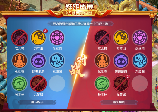 进入比赛后,【非诚勿扰】选用了“双九黎、天宫、女儿、辅助神木”组成的“双封面伤”阵容;【野兽出征】则是采用了“双九黎、天宫、女儿、普陀”组成的“双封双秒”阵容。 比赛前中期,双方打的有来有回,也都拿到了一定优势。不过,比赛第26回合时,【非诚勿扰】不仅靠着九黎城的伤害点掉了【野兽出征】一个输出点,还打出了不俗的面伤,令对手非常难受。 比赛第28回合,【非诚勿扰】乘胜追击,靠着双九黎城的爆炸面伤成功压倒【野兽出征】所有人物单位。随后,【非诚勿扰】果断拉出瞬法须弥清场,成功拿下群雄逐鹿冠军! 二、灵宝输出一招制敌,德云皓子拿下勇武冠军 在禁选阶段,【德云皓子】被禁女儿、九黎,【船坚炮利】被禁女儿、九黎。根据禁选规则,双方可以选择一个被禁门派复活。 比赛视频 进入比赛后,【德云皓子】选用了“九黎、地府、辅助神木、盘丝、东海”组成的“点杀”阵容;【船坚炮利】则采用了“辅助神木、盘丝、方寸、九黎、东海”组成的“双封”阵容。 比赛前期,双方主要以加状态和存海龟为主。不过,由于【船坚炮利】急于求成,导致其在比赛中期损失了一半海龟。比赛第40回合,【德云皓子】靠着东海渊、九黎城灵宝的压制,成功将【船坚炮利】打成残局。随后,【德云皓子】果断拉出瞬法须弥完成清场,轻松拿下本届群雄逐鹿冠军。 小结 从精锐组、勇武组的PK情况来看,九黎城依然是非禁必选的存在,大家只能在其基础上搭建相应阵容。因此,在即将到来的十月门派调整中,九黎城大概率会成为重点关照对象!当然,策划也有可能通过加强其他门派的方式降低九黎城的地位! 叶子猪梦幻西游玩家群:1群 325703083 (2000人),2群: 330102322 (千人);3群: 424986787 (游戏疑难解答);4群: 330518295 (商人物价);5群: 1063086037 (疑难解答);6群: 1045753197 (春心萌动);7群: 787195090 (活跃互动);8群: 720665628 (全民PK)